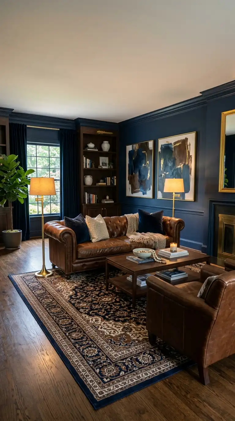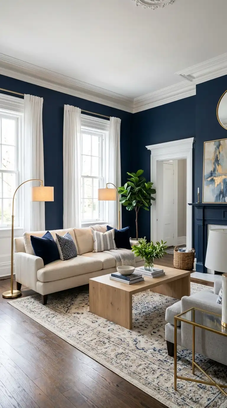 Navy blue walls create a dramatic backdrop that feels both sophisticated and cozy. The deep color envelops the room, making it feel intimate and intentional. Crisp white trim—crown molding, baseboards, window frames—provides essential contrast that defines the architecture and prevents the darkness from feeling overwhelming. White ceilings also help maintain height and airiness.