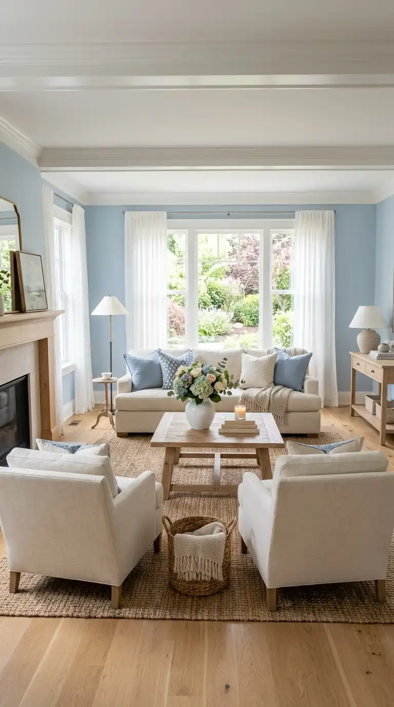 Powder blue walls create a serene, airy atmosphere that feels fresh and calming. The soft hue reflects light beautifully, making rooms feel larger and more expansive. Cream furniture pops against the pale blue backdrop, adding warmth and softness. This combination works beautifully in coastal, cottage, and casual living rooms where relaxation is key.
