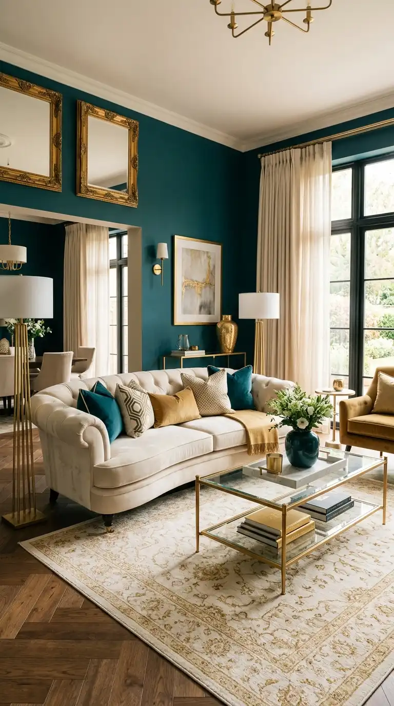 Teal walls, with their beautiful blend of blue and green, create spaces that feel both sophisticated and organic. The rich color provides the perfect backdrop for warm gold accents that add glamour and warmth. Introduce gold through lighting fixtures, coffee tables, mirror frames, and decorative accessories. Cream or white furnishings keep the space balanced and bright.