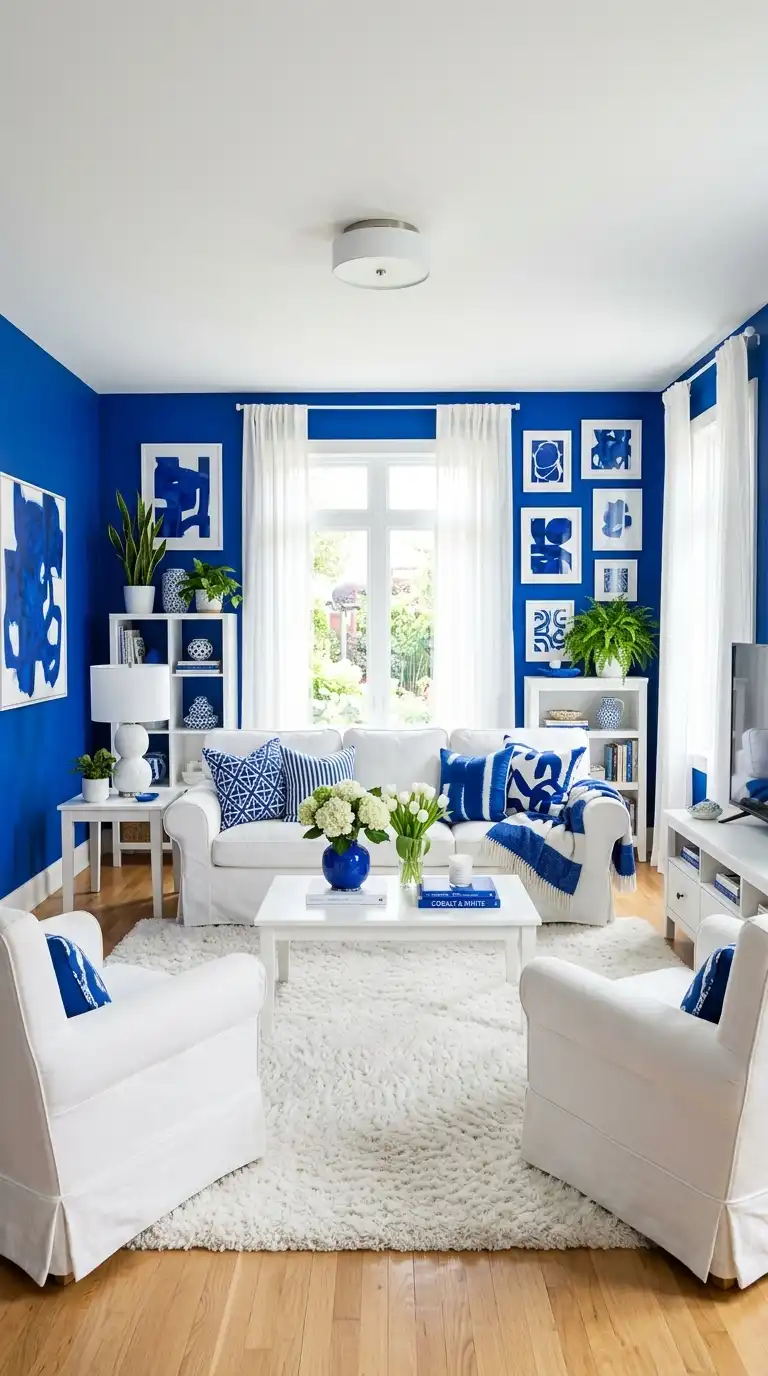 Cobalt blue walls offer vibrant, energetic color that pairs brilliantly with crisp white furniture for spaces that feel bold and graphic. The high-contrast combination creates instant drama and visual interest. Use white sofas, chairs, and accessories against the cobalt backdrop to let the wall color take center stage while maintaining balance and brightness.