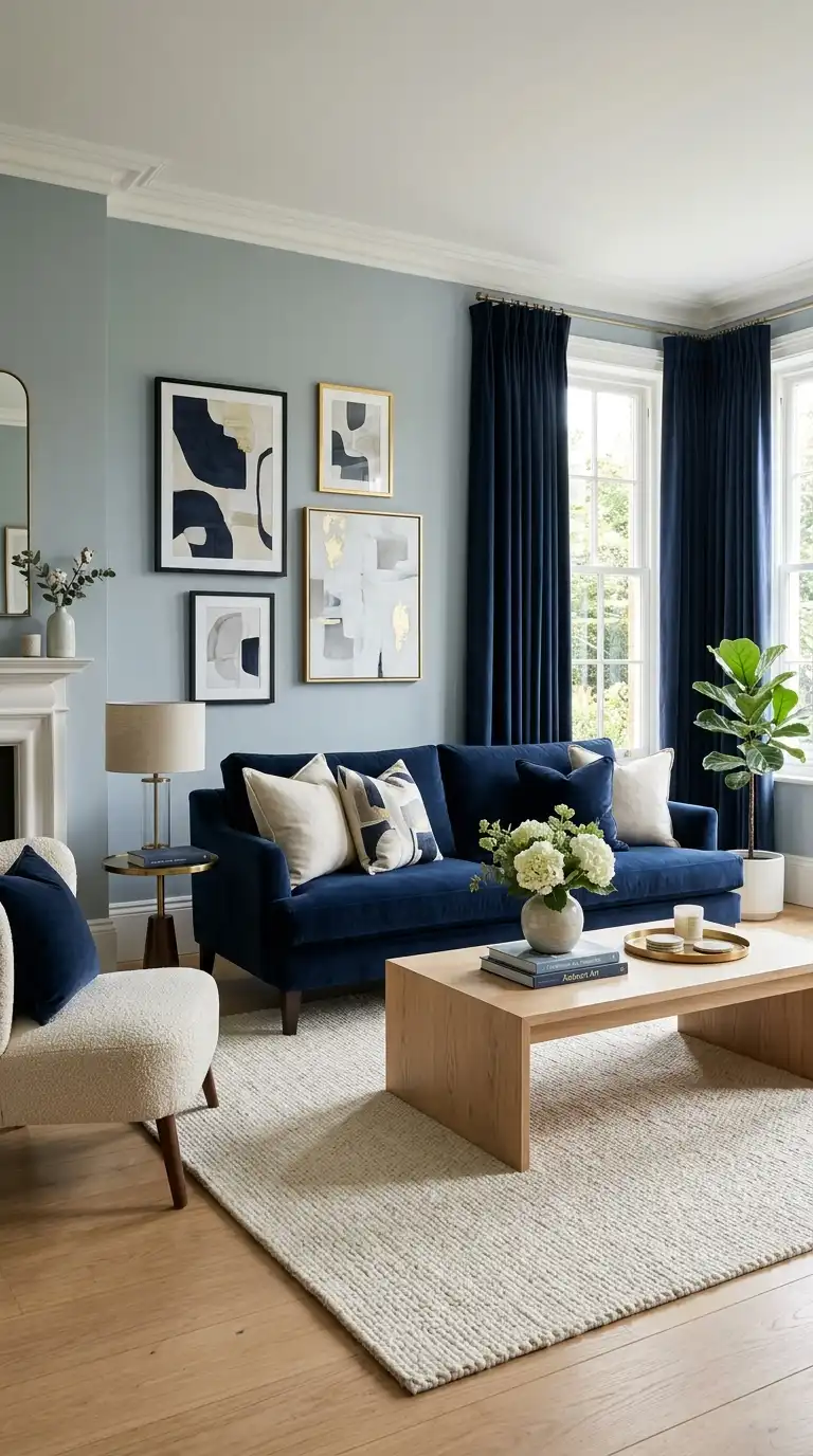 Blue-grey walls offer the perfect middle ground—cool and calming with enough depth to feel substantial. This versatile hue works as a neutral backdrop that allows navy accents to pop beautifully. Use navy on sofas, curtains, or area rugs to add richness and contrast against the soft blue-grey walls. Cream and white elements keep the palette light and balanced.
