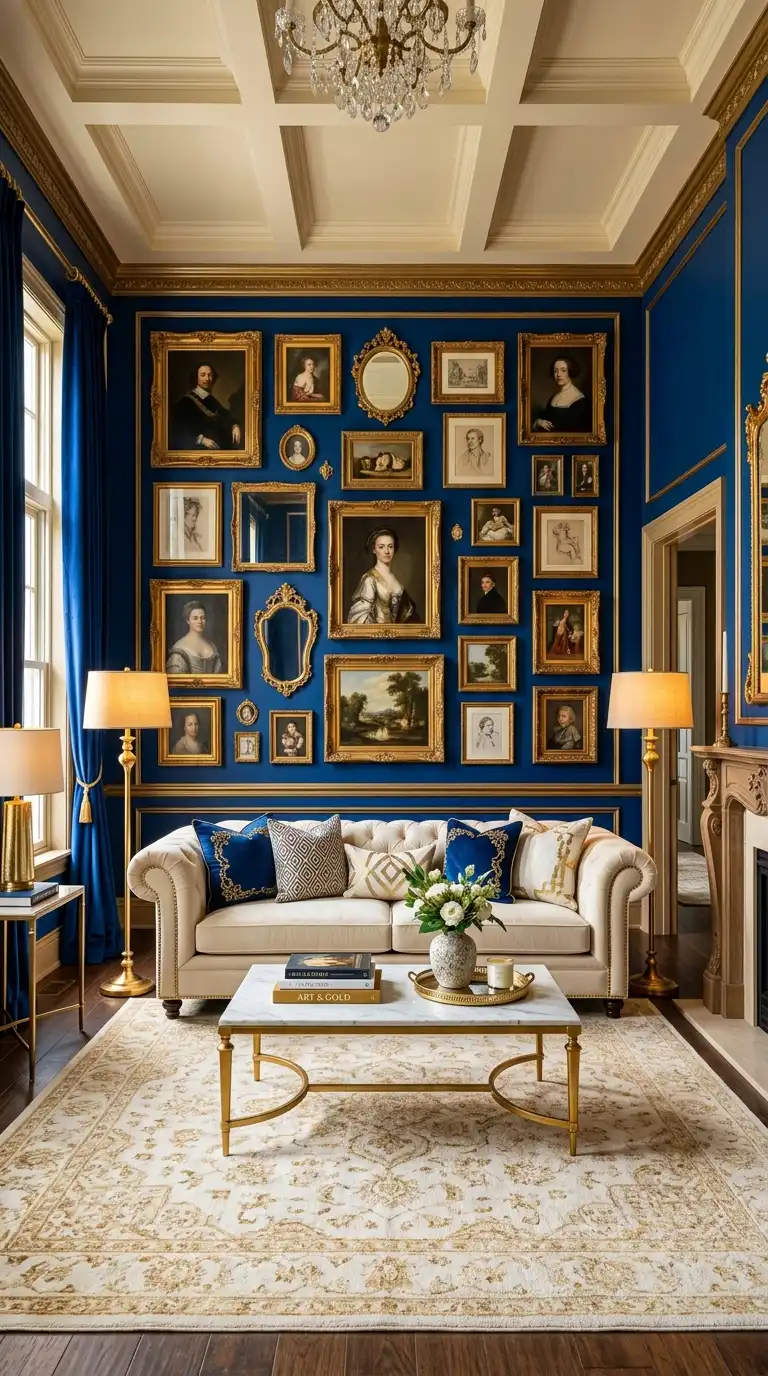 Royal blue walls create a rich, regal backdrop that feels luxurious and dramatic. The deep, saturated hue provides the perfect canvas for an arrangement of gold-framed artwork and mirrors. The warm metallic frames pop against the cool blue, creating a stunning gallery wall effect. Cream or white furnishings keep the space balanced and prevent the dark walls from feeling overwhelming.