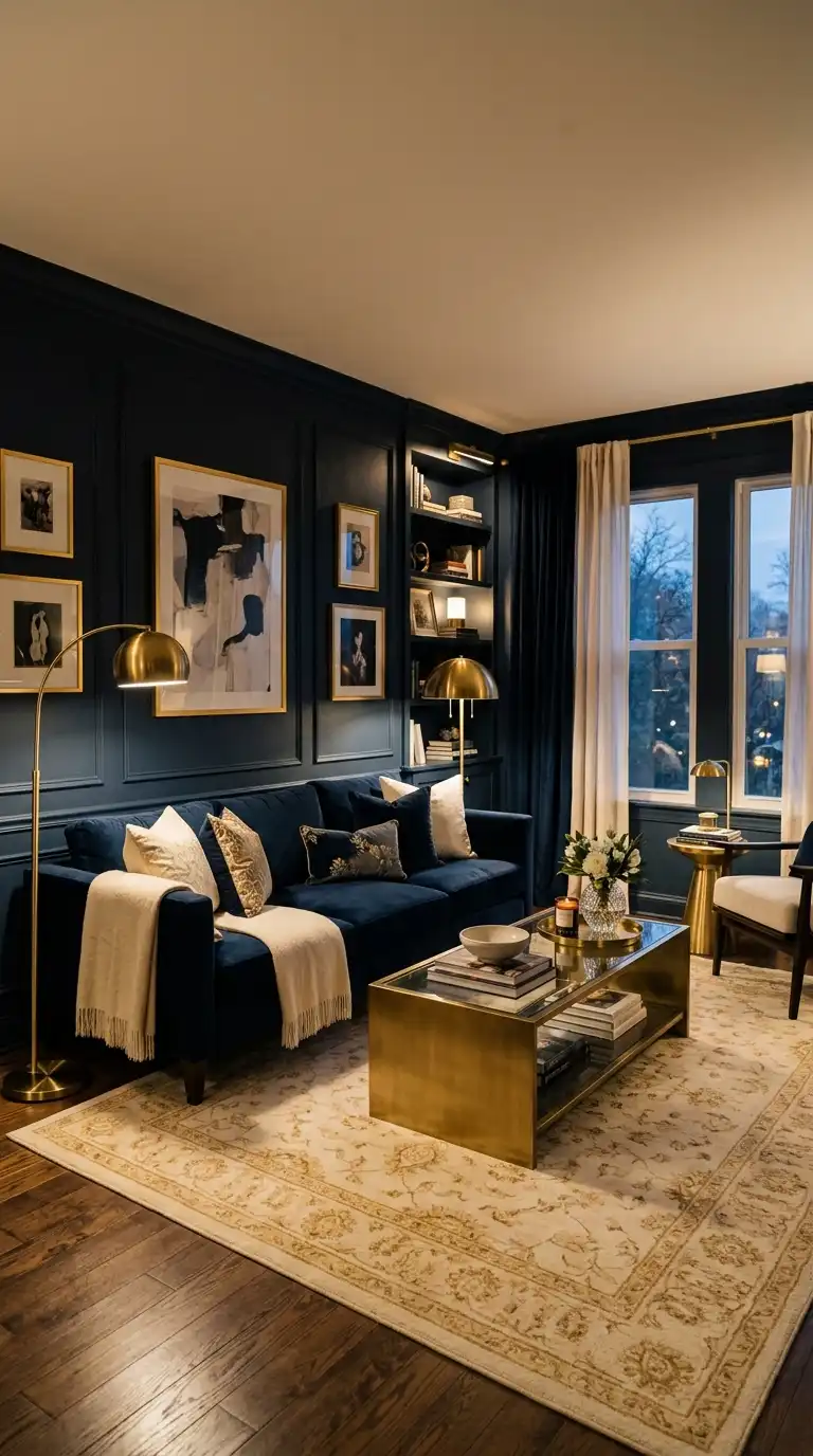 Midnight blue walls create a dramatic, intimate atmosphere that feels luxurious and cozy. Paired with a matching velvet sofa in a similar deep blue, the monochromatic scheme feels rich and intentional. Add metallic accents—gold or brass—through lighting and accessories to create points of light and warmth against the dark palette. Cream or white elements provide necessary contrast and breathing room.