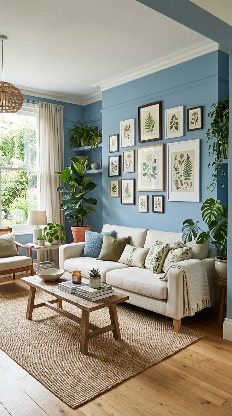 Blue walls provide the perfect backdrop for botanical prints that bring the beauty of nature indoors. The cool blue enhances greens and organic textures, creating spaces that feel fresh, alive, and deeply connected to nature. Arrange botanical prints in various sizes and frames on the blue wall for a collected, gallery-style display. Natural wood furniture and plenty of live plants complete the organic feel.