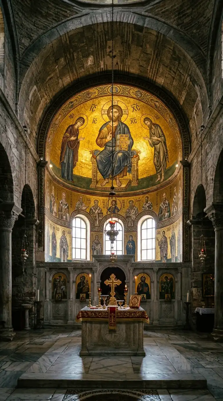 The apse is the semi-circular or polygonal termination of the church at the east end. The apse contains the altar. The apse is decorated with a mosaic of Christ or the Virgin. The apse is sacred, apsidal, and mosaic-decorated.