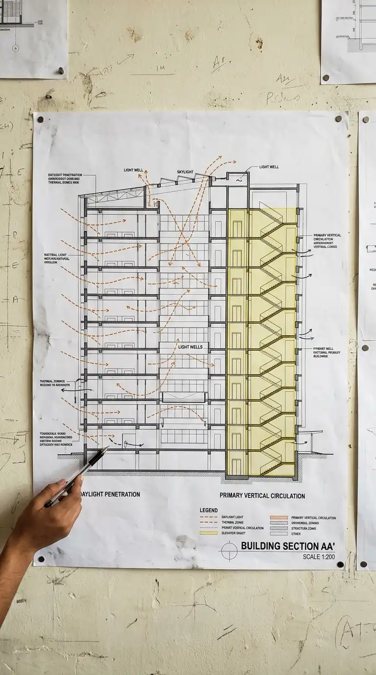 The section analysis sheet focuses on the building’s section. The section is drawn at scale. Vertical circulation is highlighted. Light penetration is shown. Spatial relationships are analysed. The section analysis sheet is sectional, analytical, and light-focused.