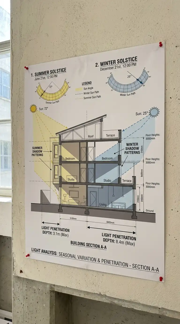 The light analysis sheet focuses on natural light. The section is the base. Sun angles are drawn for summer and winter. Shadow patterns are shown. Light penetration depth is measured. The light analysis sheet is luminous, seasonal, and shadow-focused.