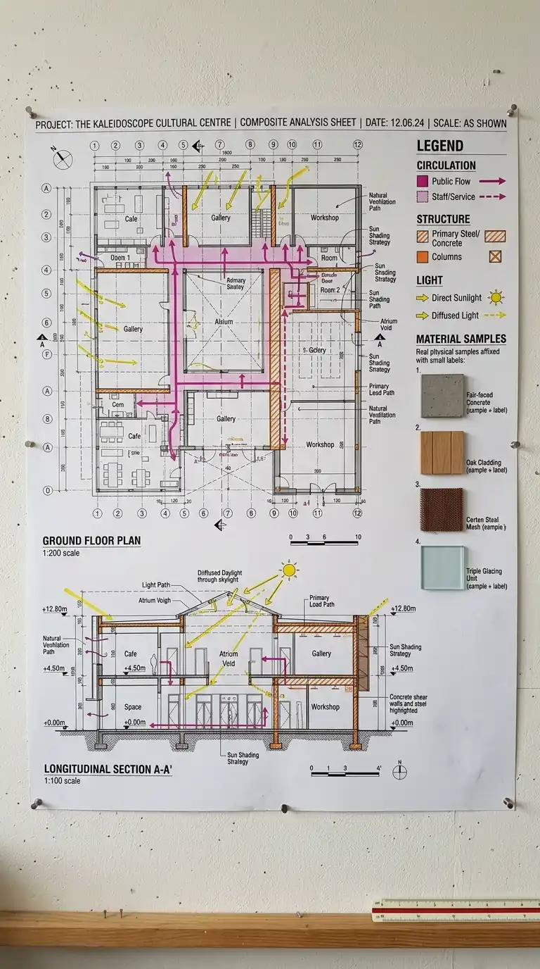 The composite analysis sheet combines multiple analysis types on one sheet. Plan, section, circulation, structure, light, and material are all shown. The composite sheet is dense, comprehensive, and layered.