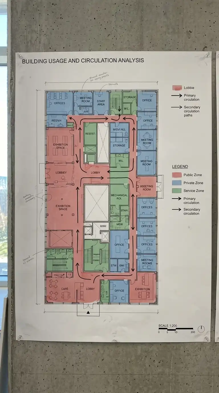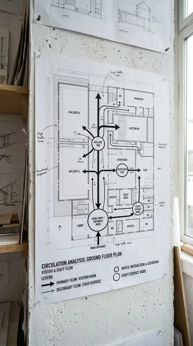 The circulation analysis sheet focuses on how people move through the building. The plan is the base. Arrows show primary, secondary, and service circulation. Nodes (entrances, stairs, elevators) are marked. The circulation analysis sheet is circulatory, directional, and nodal.