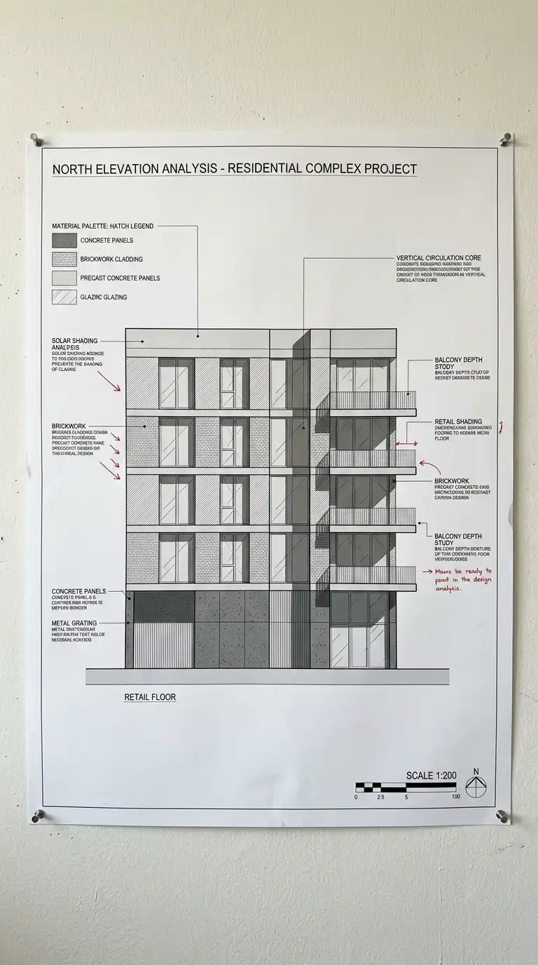 The elevation analysis sheet focuses on the building’s facade. The elevation is drawn at scale. Material patterns are indicated. Window-to-wall ratio is analysed. Shadow patterns are studied. The elevation analysis sheet is elevational, analytical, and material-focused.