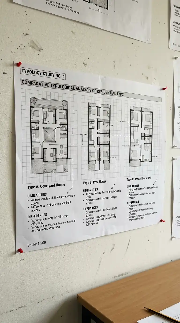 The typological analysis sheet compares the building to other buildings of the same type. Multiple plans or sections are drawn at the same scale. Similarities and differences are noted. The typological analysis sheet is comparative, scaled, and typological.