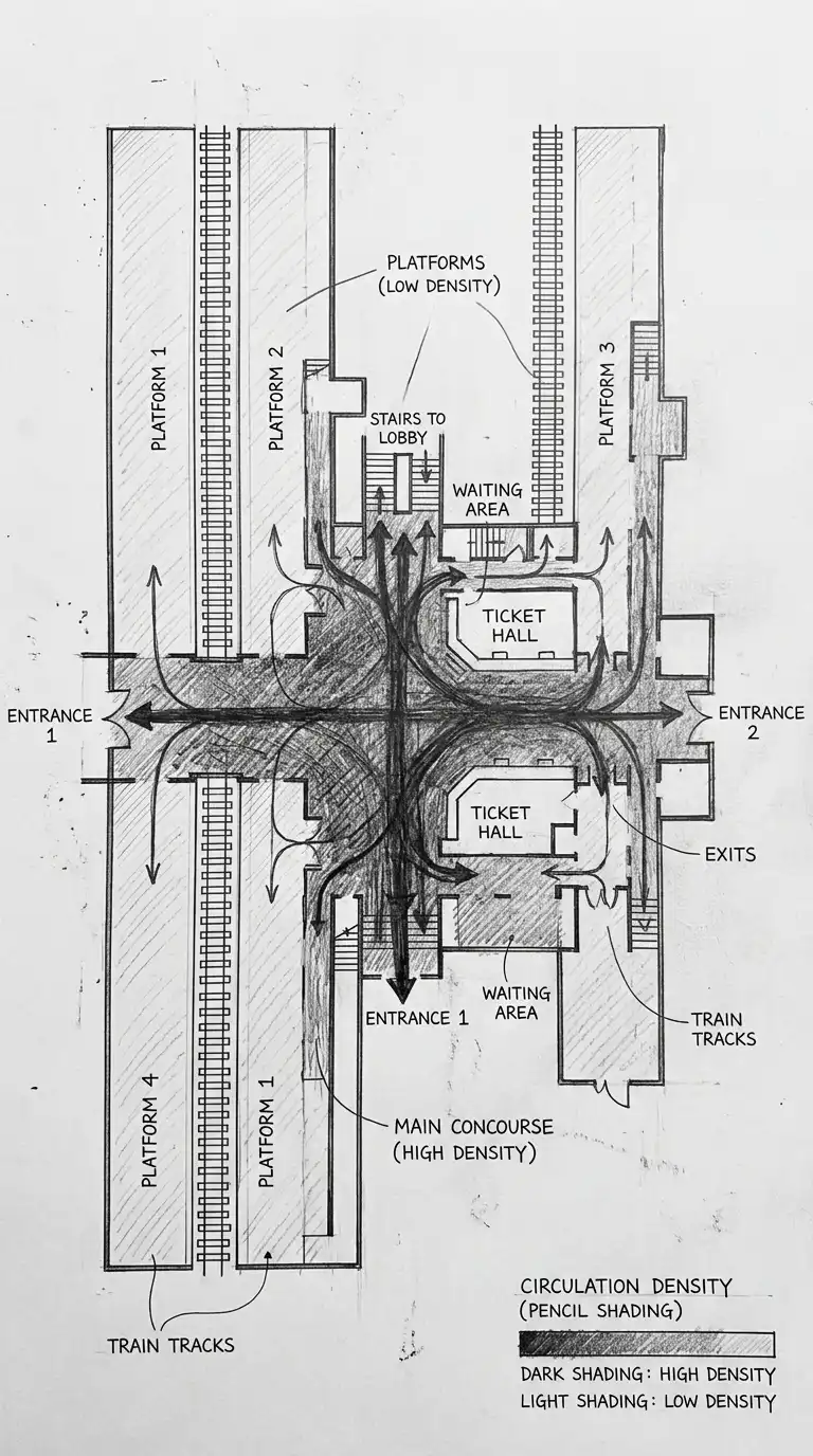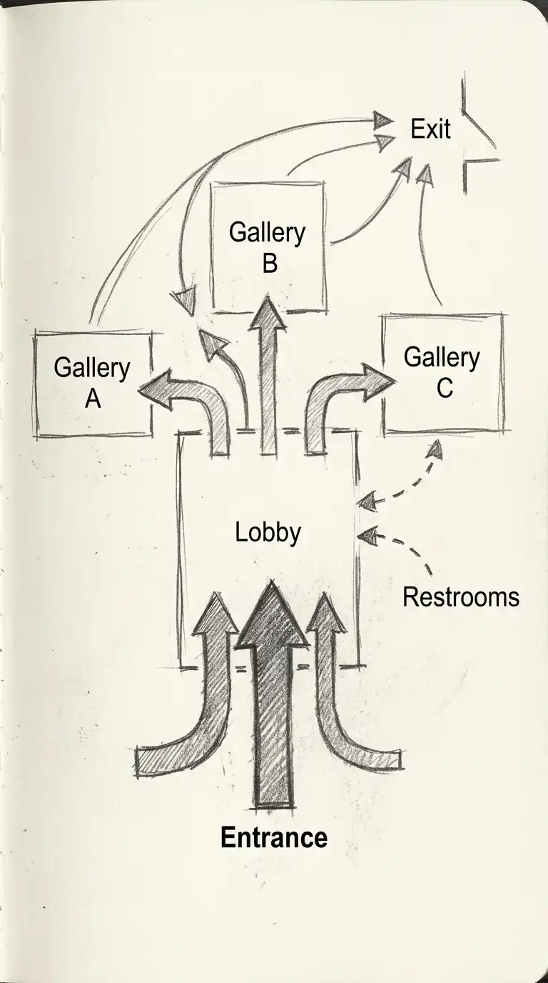 A circulation diagram is a diagram that shows how people move through a building or site. Unlike a floor plan, which shows walls and rooms, a circulation diagram shows paths, direction, flow, and nodes. Circulation is the movement of people — entering, exiting, walking, waiting, turning, gathering. A good circulation diagram makes movement visible.