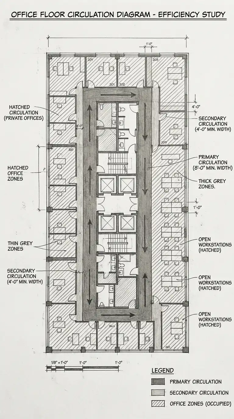 The circulation zone diagram shows the space dedicated to movement separate from occupied space. Primary circulation (main corridors, stairs) is one zone. Secondary circulation (hallways, ramps) is another zone. Occupied zones (rooms, offices) are separate. The circulation zone diagram is ideal for efficiency studies.