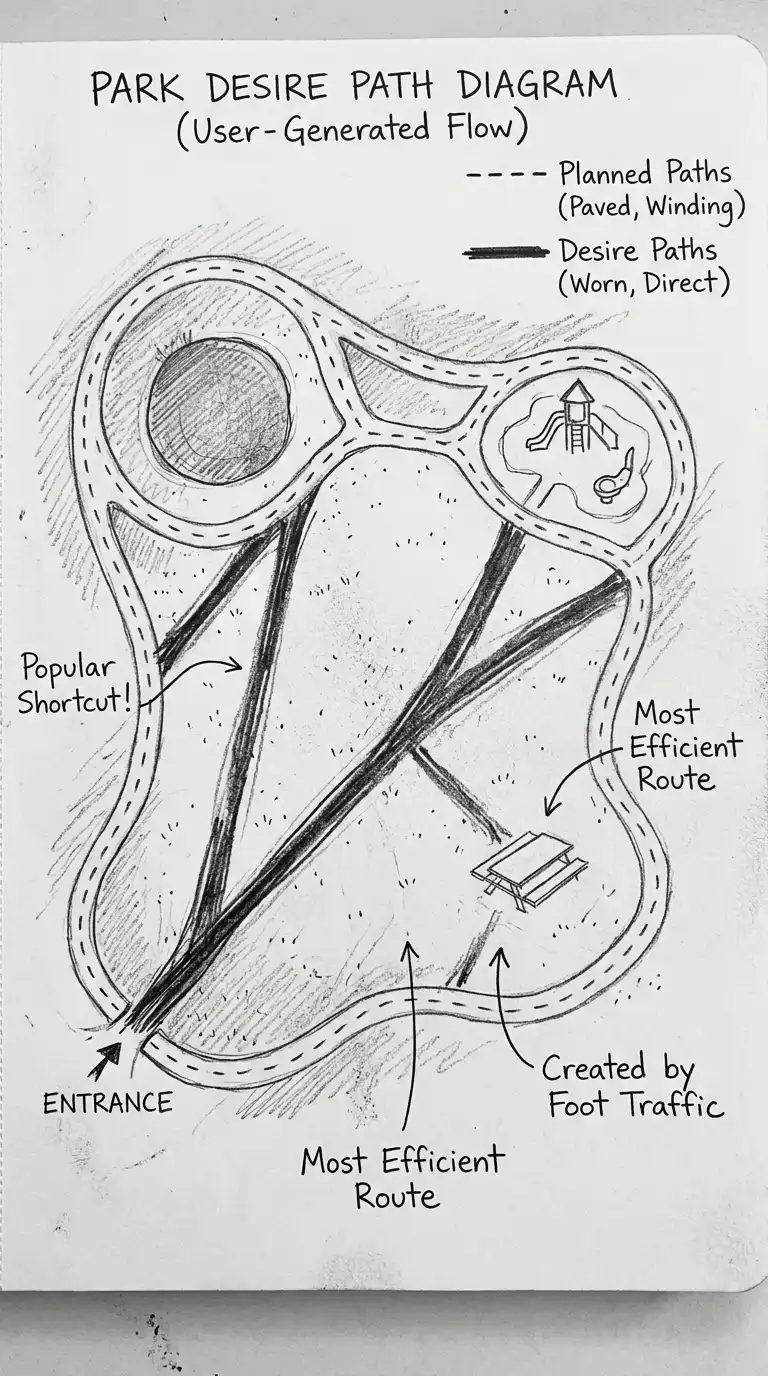The desire path diagram shows where people actually walk, not where the architect planned. Desire paths are worn into grass or snow. They show the shortest, most convenient route. The desire path diagram is ideal for site planning and landscape architecture.