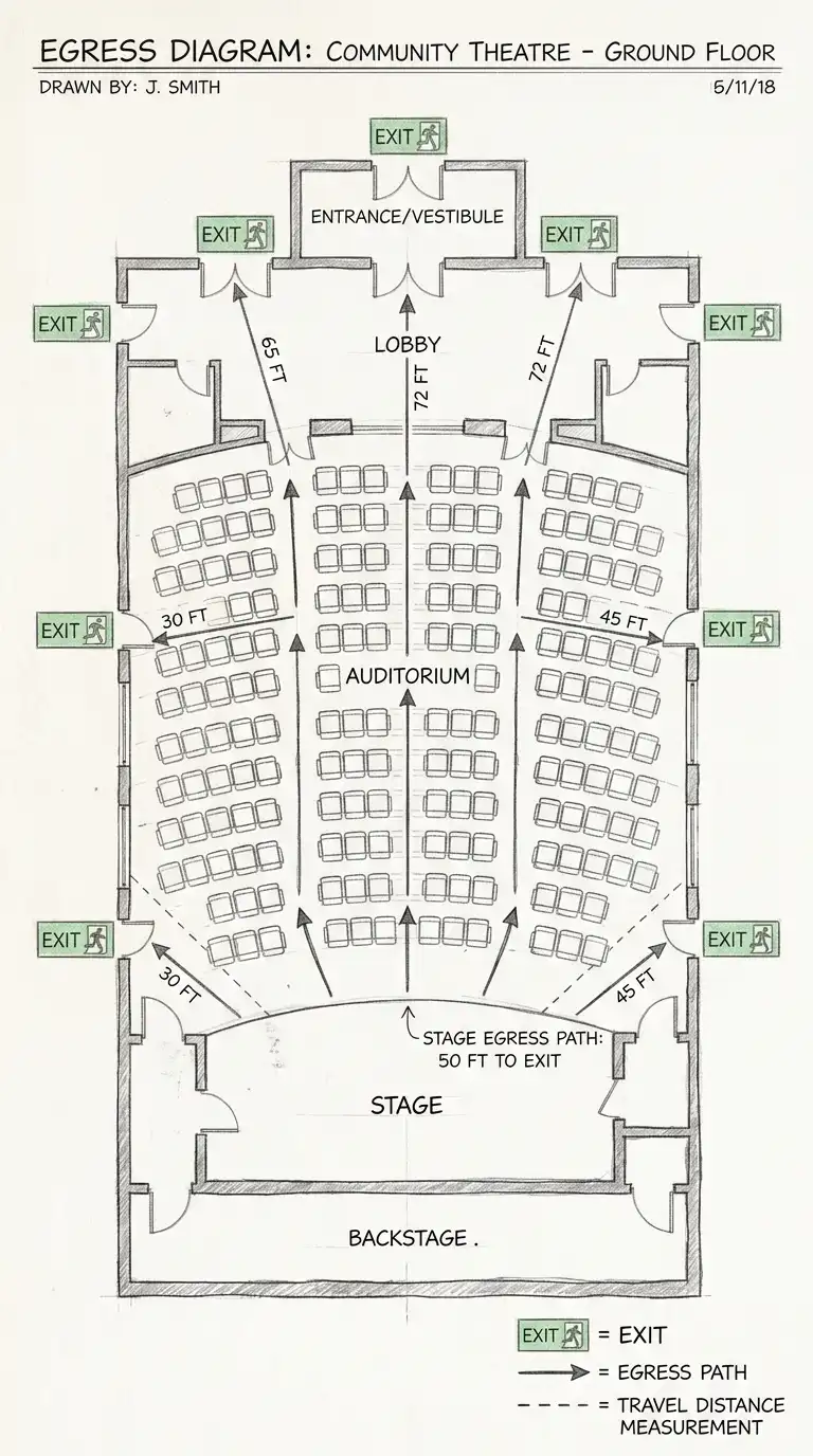 The egress diagram shows emergency exit routes. The diagram shows the shortest path from any point to an exit. The diagram is required for building codes and safety plans. The egress diagram is ideal for fire safety and accessibility.