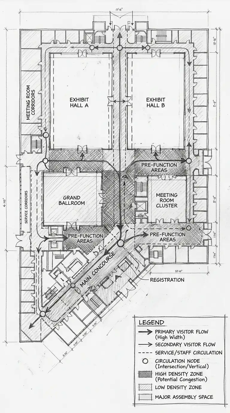 This diagram is ideal for stadiums, train stations, and convention centres. The emotional effect is dense, congested, and heat-mapped.
