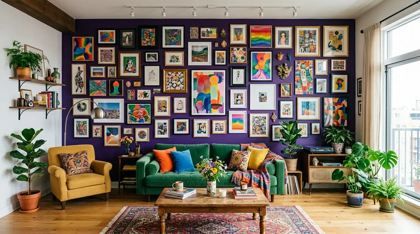 Maximize your vertical space by turning an entire wall into a dense arrangement of art with no single color theme. Mix neon pop-art with gilt-framed classical portraits to create a high-contrast visual feast that makes the room pulse with energy.