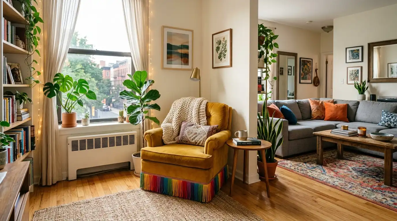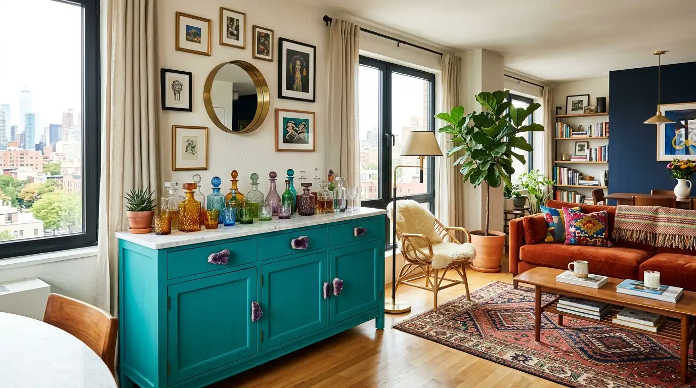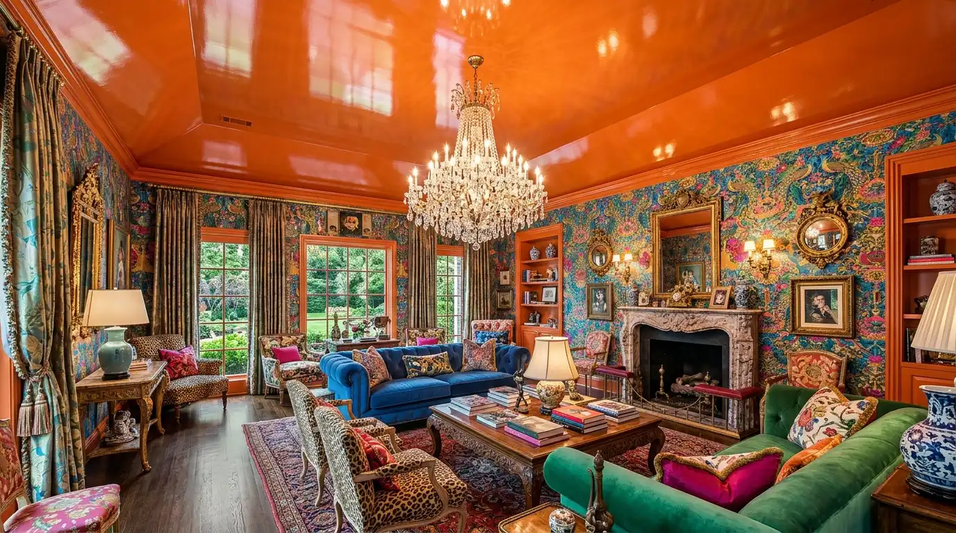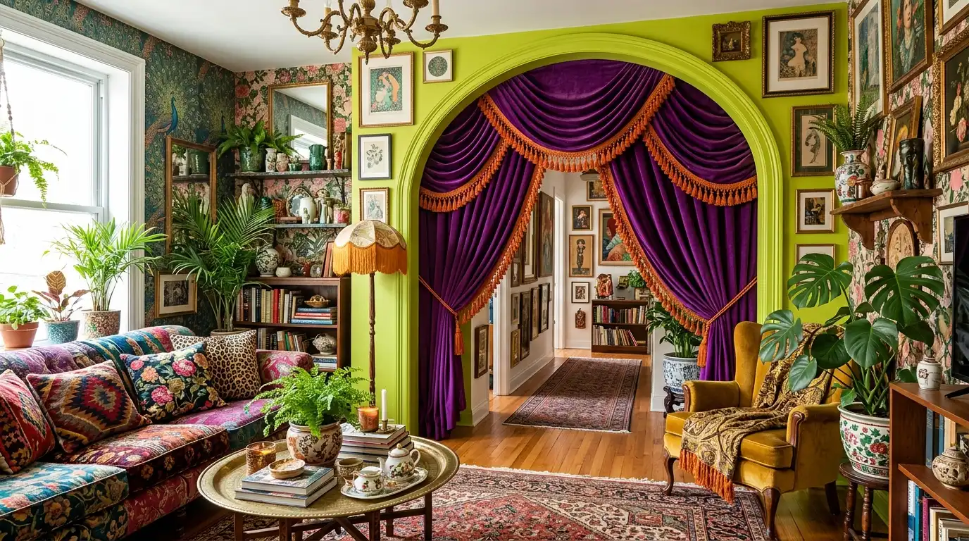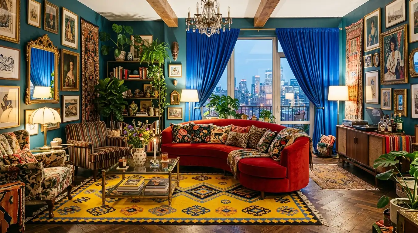 Pair a bright red velvet sofa with electric blue curtains and a lemon yellow rug. This bold use of primary colors provides a sharp, sophisticated visual “clash” that defines the unapologetic spirit of modern maximalism.