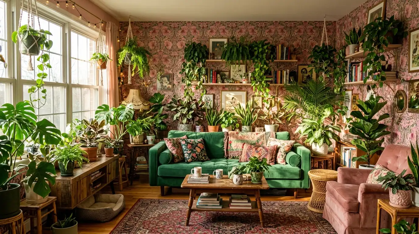 Go beyond green by incorporating tropical plants with colorful foliage, like pink aglaonemas or purple tradescantia. Layer these against floral wallpapers to create a lush, living canopy of multi-colored organic texture.