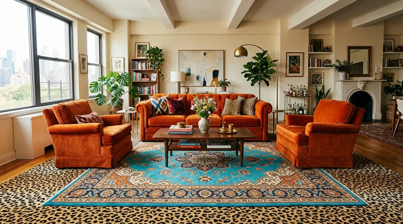 Layer a vibrant turquoise Persian rug over a larger leopard-print carpet. This adds physical and visual warmth, defining a central “hub” for social interaction while maximizing the floor’s textural and color complexity.