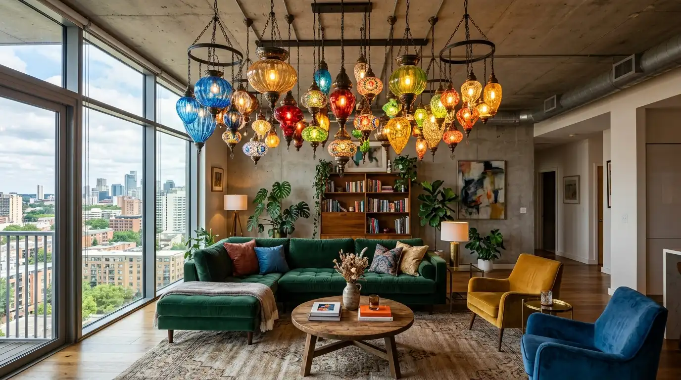 Instead of one central light, hang a cluster of varied pendant lights in multi-colored Murano glass. Lighting in a colorful maximalist room should act as a glowing sculpture that refracts different hues across every surface.