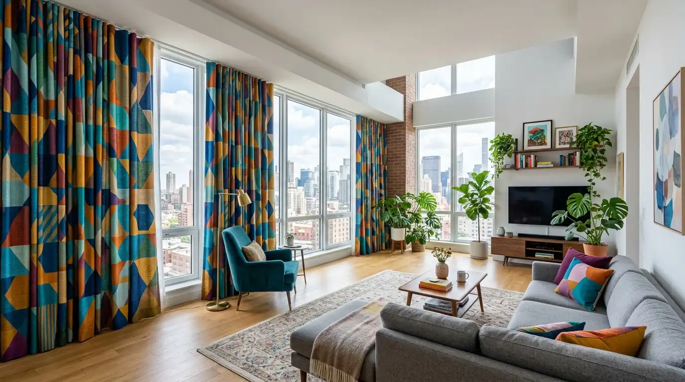 Use extra-long curtains featuring a bold, multi-colored geometric “prism” pattern. The sheer volume of colorful fabric acts as a soft architectural wall that anchors the room’s diverse palette.