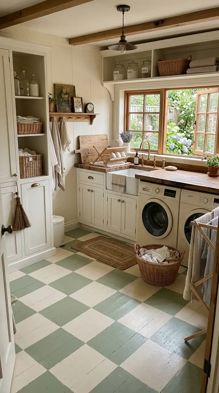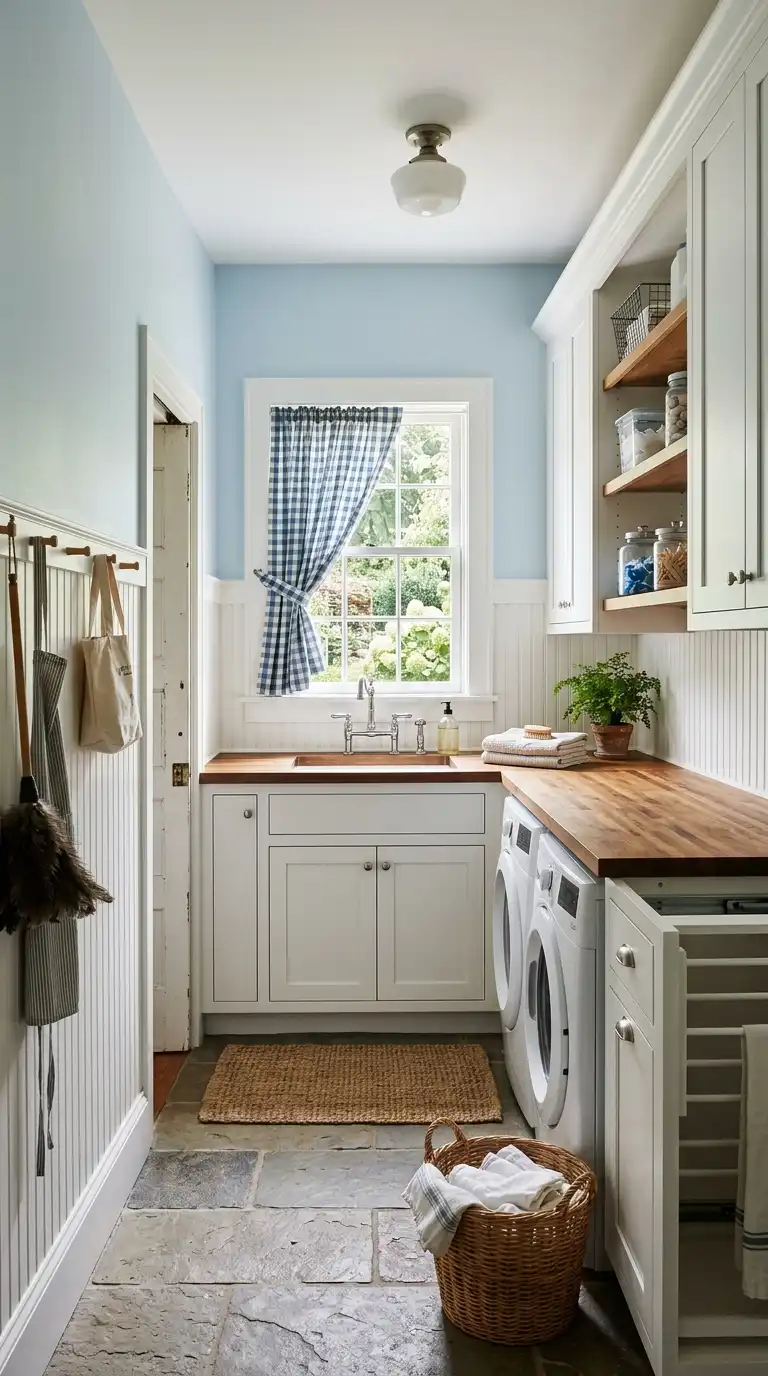A cottage laundry room is warm, inviting, and full of character. Whether you choose beadboard walls, a farmhouse utility sink, open shelving with collected pieces, checked curtains, a ladder drying rack, a galvanized tub hamper, vintage signs, a butcher block countertop, woven baskets, a clothespin bag, a painted floor, or an antique washboard display, each element adds charm and personality. Mix and match these ideas to create a laundry room that feels cozy, personal, and a little bit like a step back in time.