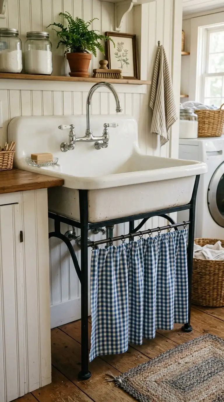 A deep farmhouse utility sink is both practical and charming. Look for a white enamel or fireclay sink with a apron front. Pair it with a bridge faucet in chrome or brushed nickel. The sink is perfect for soaking stained clothes and hand-washing delicates. Use the space under the sink for a curtain instead of cabinet doors.