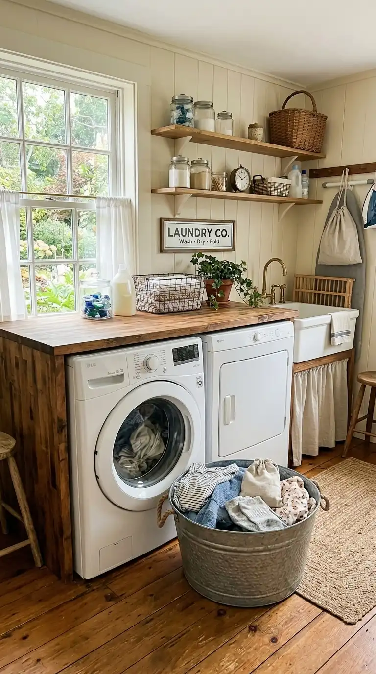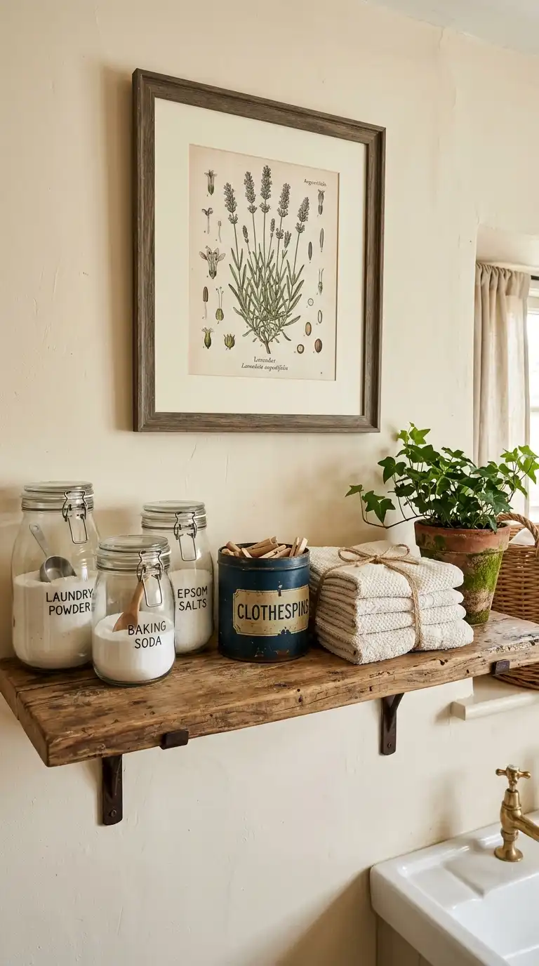 Replace upper cabinets with open wooden shelves. Display your laundry supplies in glass jars, vintage tins, and ceramic containers. Mix in a few collected pieces like an old enamel pitcher, a stack of vintage books, or a small plant. The open shelves feel personal and curated, not mass-produced.