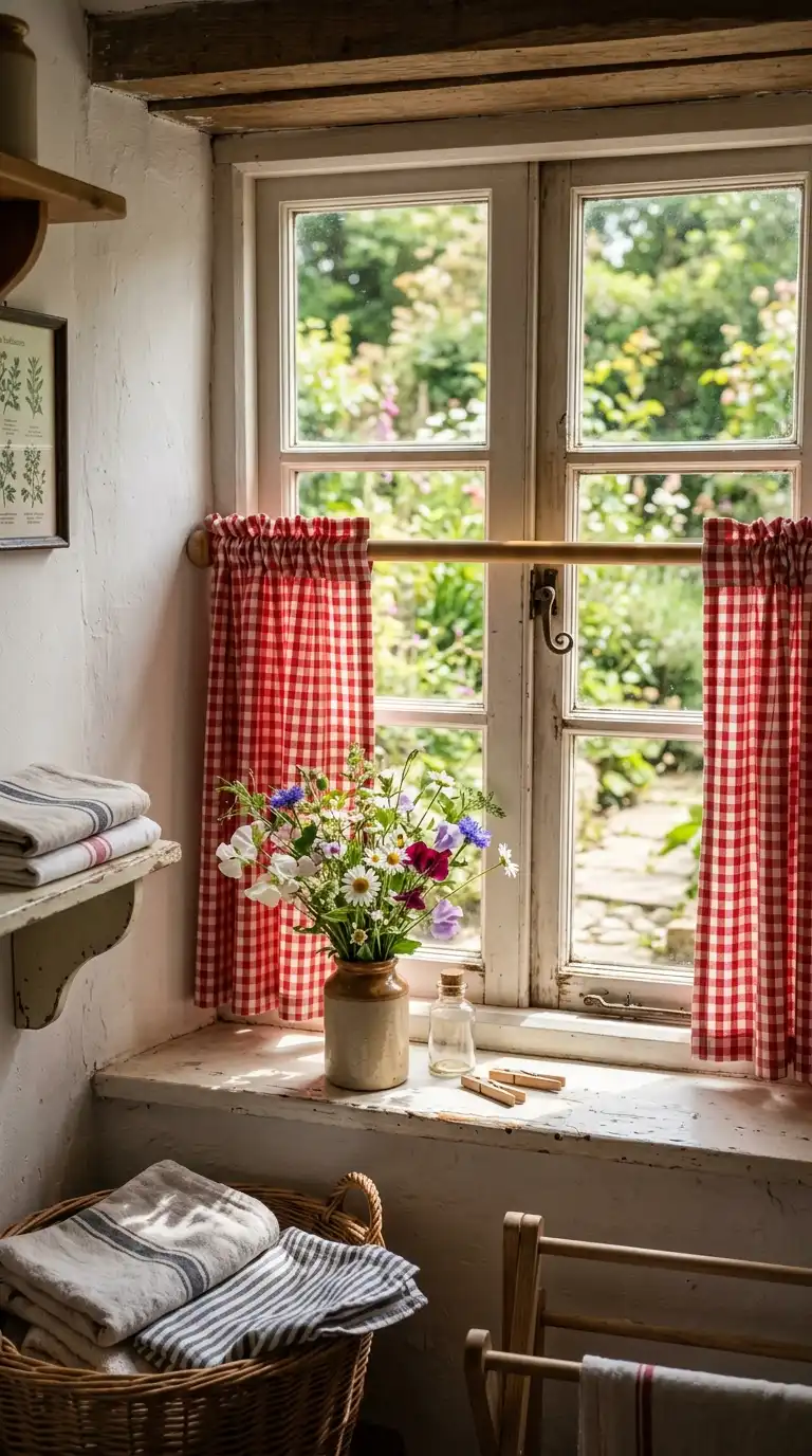 Soft window treatments add cottage charm. Hang checked curtains (gingham or buffalo check) in red, blue, or black and white. For a more romantic look, use floral or cabbage rose fabric. Cafe curtains that cover only the lower half of the window are especially cottage-appropriate.