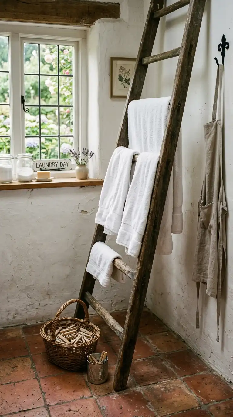 Use an old wooden ladder as a drying rack. Lean it against the wall, and hang delicates or towels over the rungs. The ladder adds rustic charm and provides functional drying space. Look for an antique ladder at a flea market or distress a new one with sandpaper and paint.