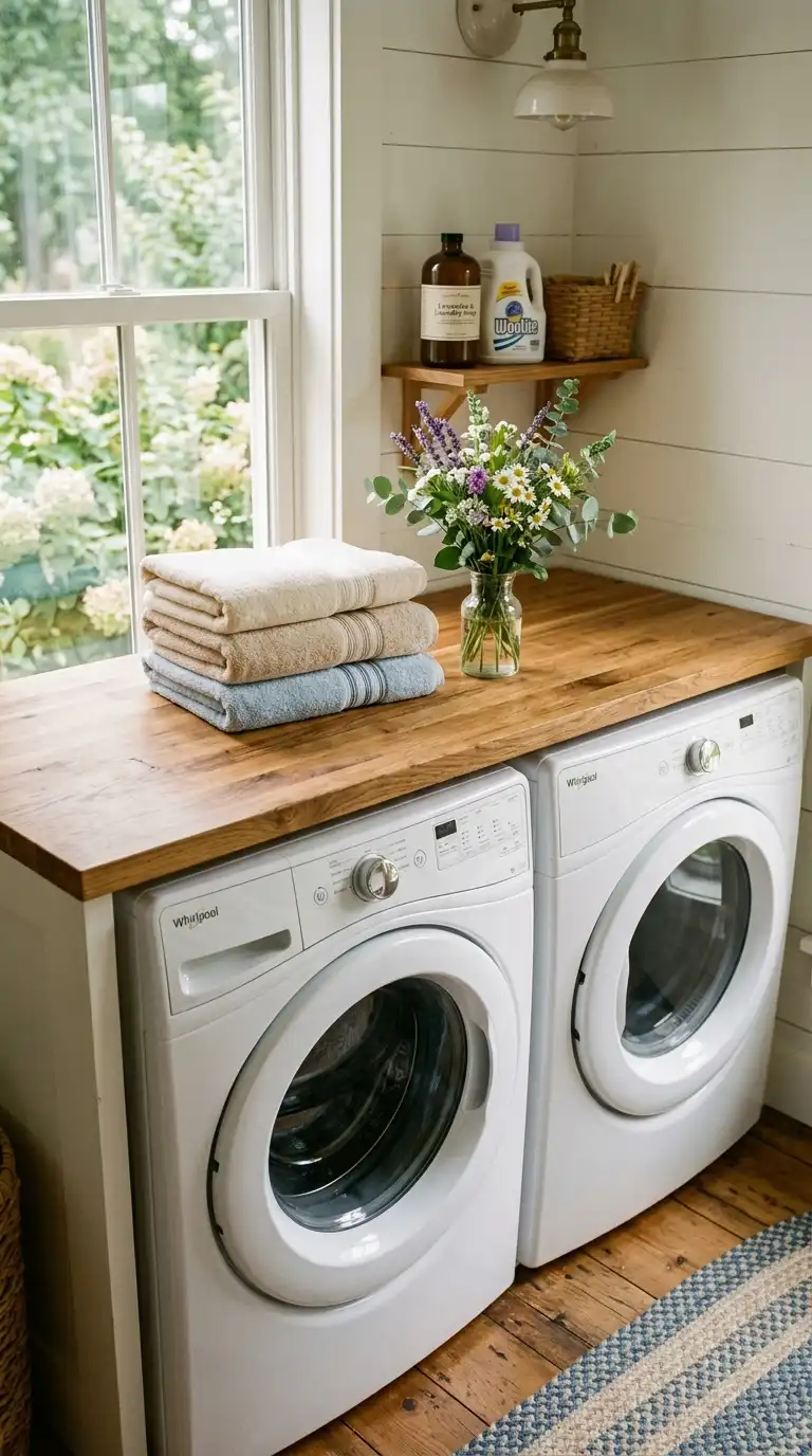 A butcher block countertop adds warmth and natural beauty to a cottage laundry room. Use it over your washer and dryer or on a freestanding folding table. The wood contrasts beautifully with white cabinets and beadboard. Seal it with water-resistant polyurethane to protect against moisture.