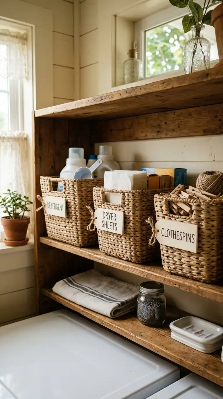 Use woven seagrass, wicker, or rattan baskets to store laundry supplies. The natural texture adds warmth and fits perfectly with cottage style. Label the baskets with chalkboard tags or fabric labels. Stack them on open shelves or tuck them under a counter.