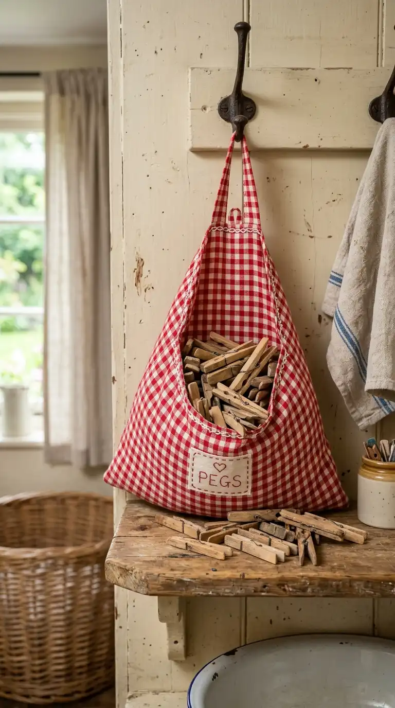 Hang a fabric clothespin bag from a hook or clothesline. Look for a bag made of cotton with a metal hanger, or sew your own from retro fabric. Fill the bag with wooden clothespins. The bag is both functional and decorative, adding a handmade touch.