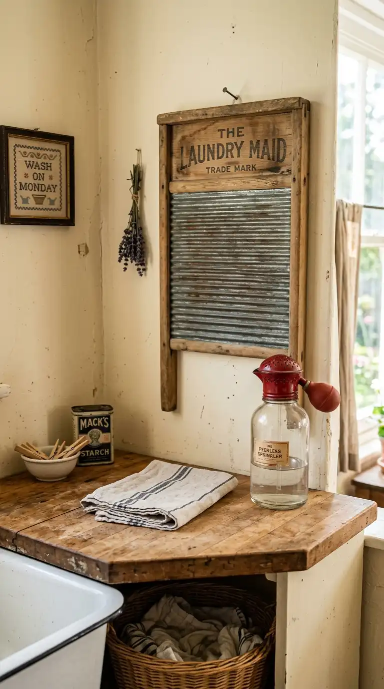Hang an antique washboard on the wall as decorative art. The washboard is a nod to laundry days of the past and adds rustic texture. Look for one with a colorful graphic or a glass rubbing surface. Group it with other vintage laundry tools like a sad iron or a clothes sprinkler bottle.