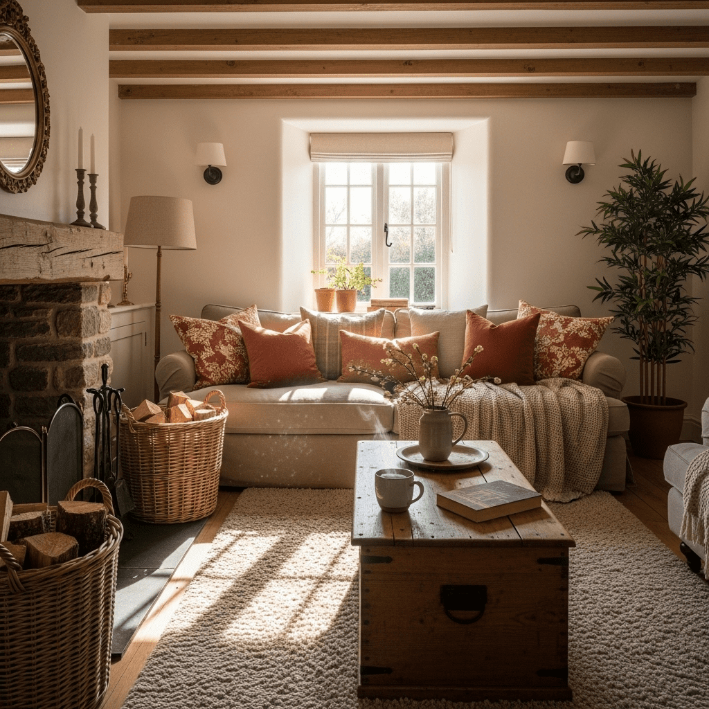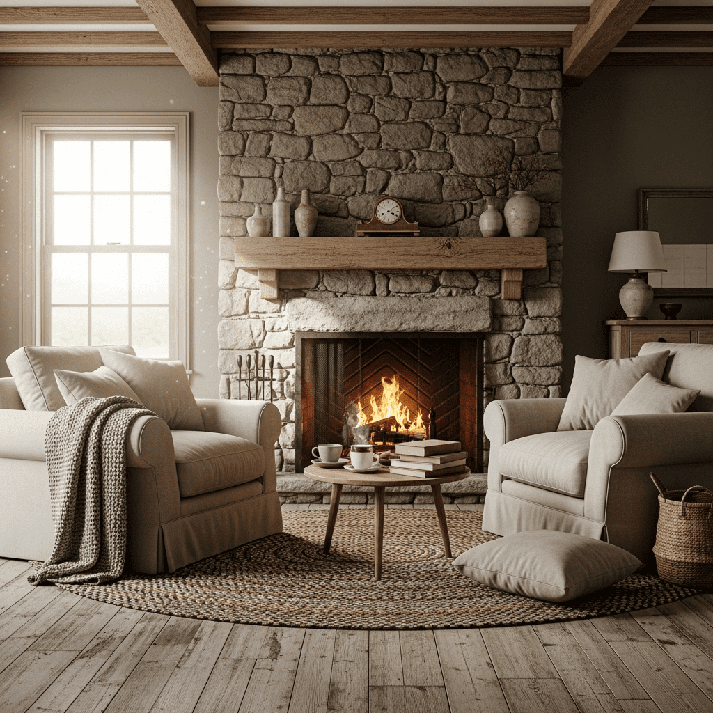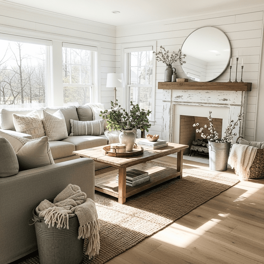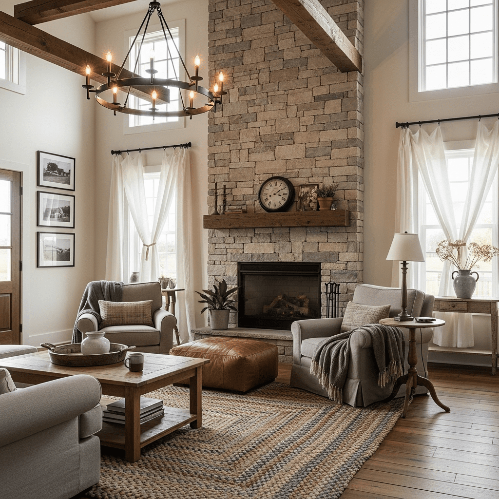Cozy farmhouse living room designs are centered on the concept of “hunker down” comfort. This aesthetic blends the practical, sturdy roots of rural life with soft, modern layers that make a house feel like a home. The hallmarks of this style include reclaimed wood, natural fibers like jute and linen, and a palette of warm whites and earthy neutrals. From the rugged charm of a stone hearth to the softness of a slipcovered sofa, these 12 designs demonstrate how to create a space that feels both timeless and deeply relaxing.