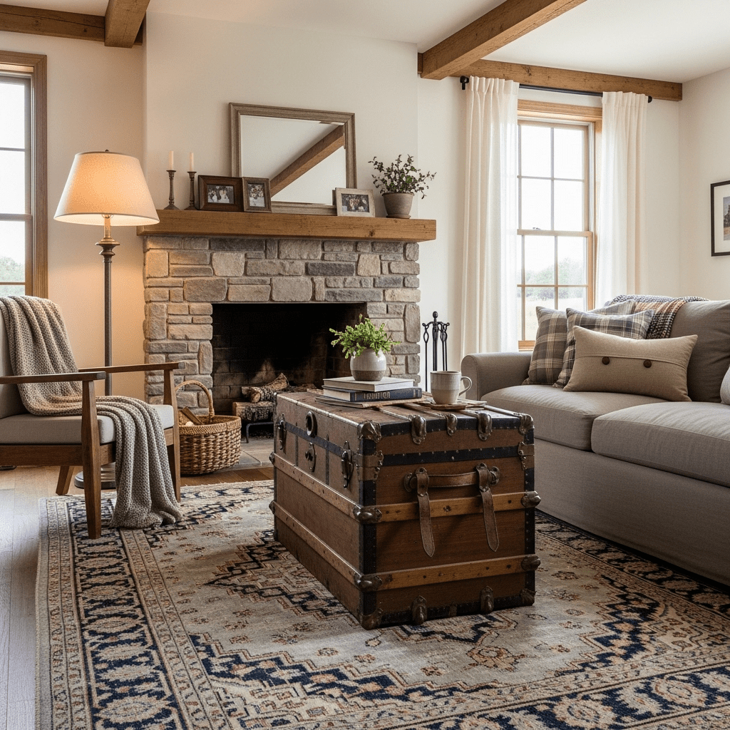 Replacing a traditional coffee table with an antique wooden or metal-bound trunk. It adds storage and a sense of “found” character to the lounge.