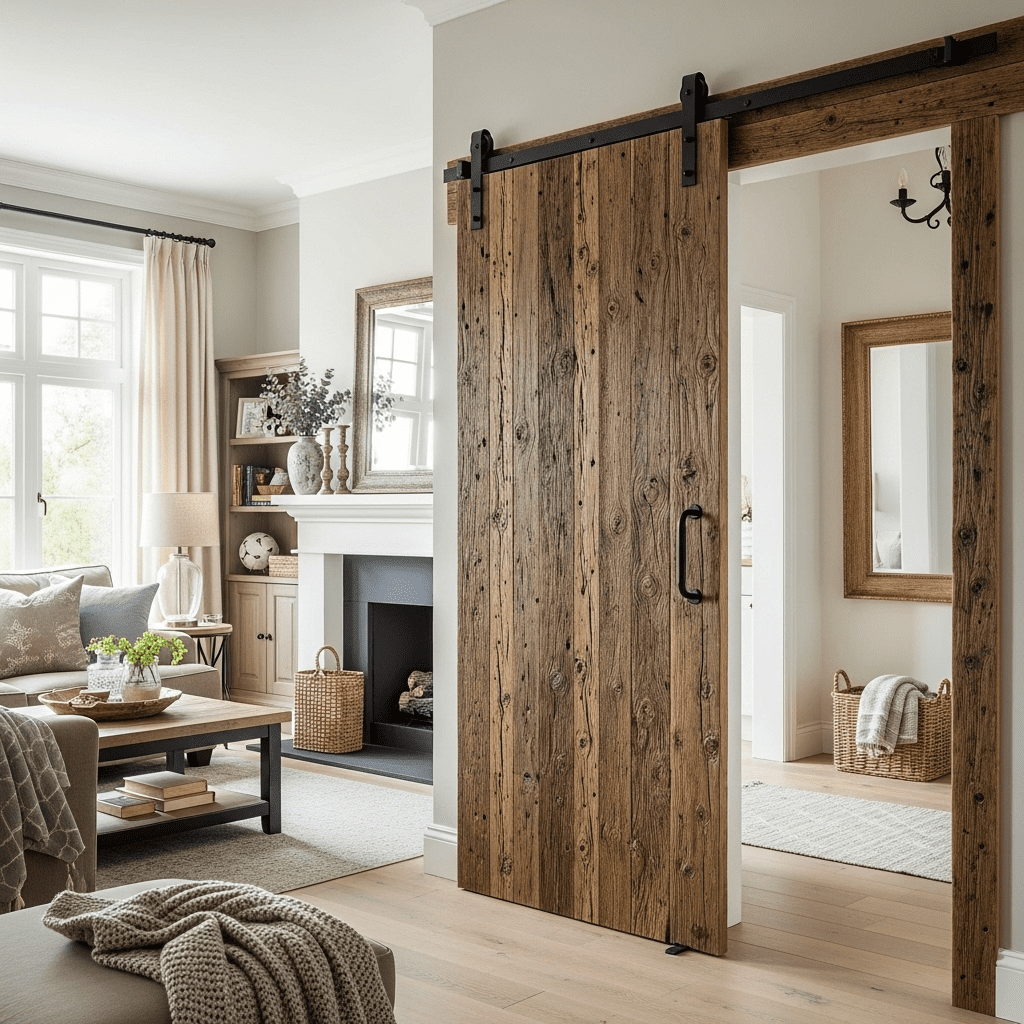 Replacing standard doors with a massive sliding barn door on a black metal track. It serves as both a functional room divider and a piece of wall art.