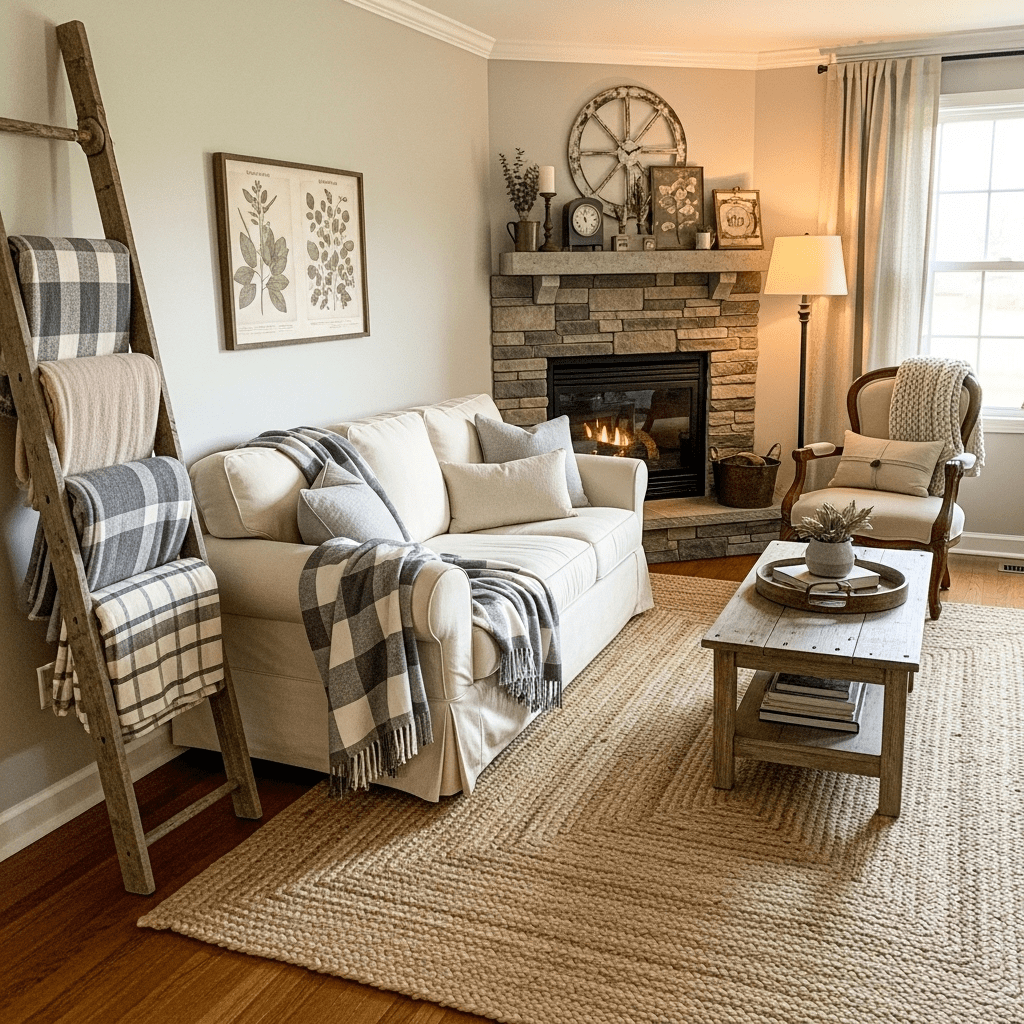 Adding a touch of heritage with subtle plaid or gingham patterns on throw blankets and pillows, typically in muted shades of gray, navy, or sage.