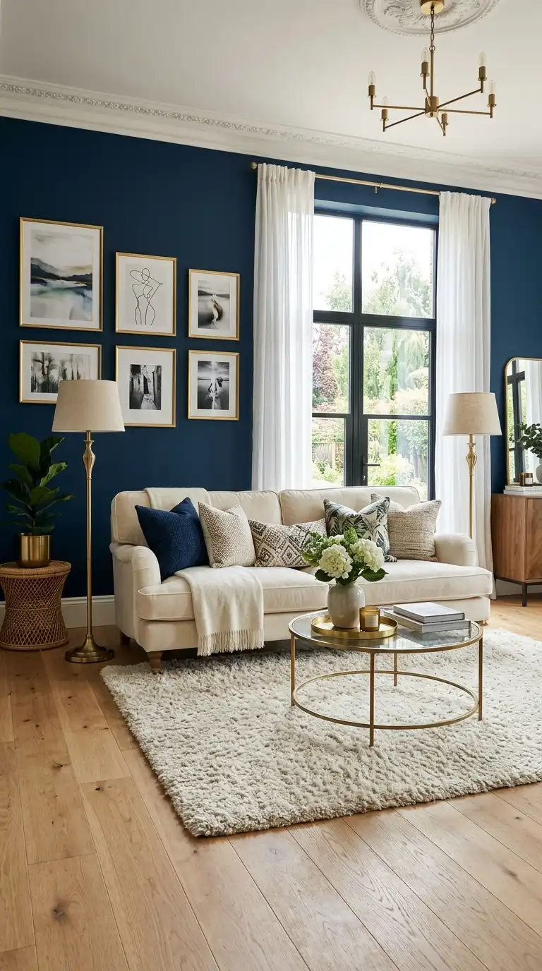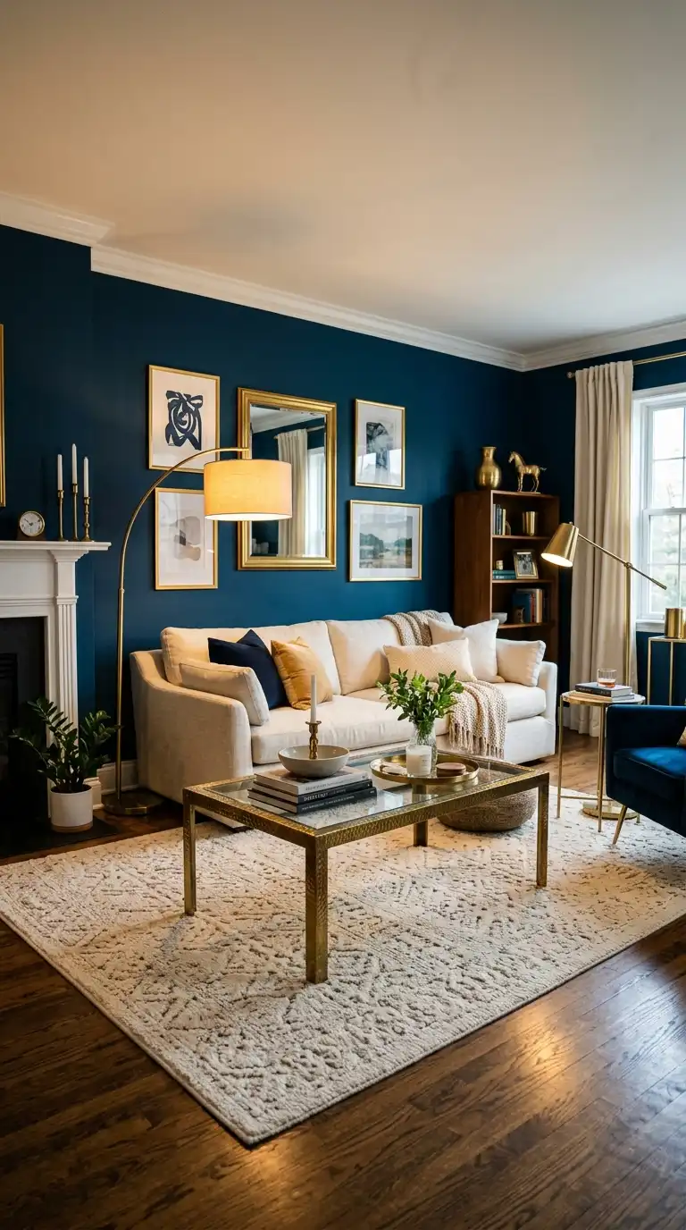 A deep blue wall provides a stunning backdrop for a gallery wall of gold-framed artwork. The deep, rich hue makes the gold frames pop, creating a sophisticated, gallery-like atmosphere. Use a mix of artwork in various sizes and styles—black and white photography, colorful abstracts, botanical prints—to add visual interest. A cream or beige sofa below the gallery wall provides balance, while brass floor lamps and a gold coffee table reinforce the metallic theme. This combination is perfect for living rooms that celebrate art and elegance.