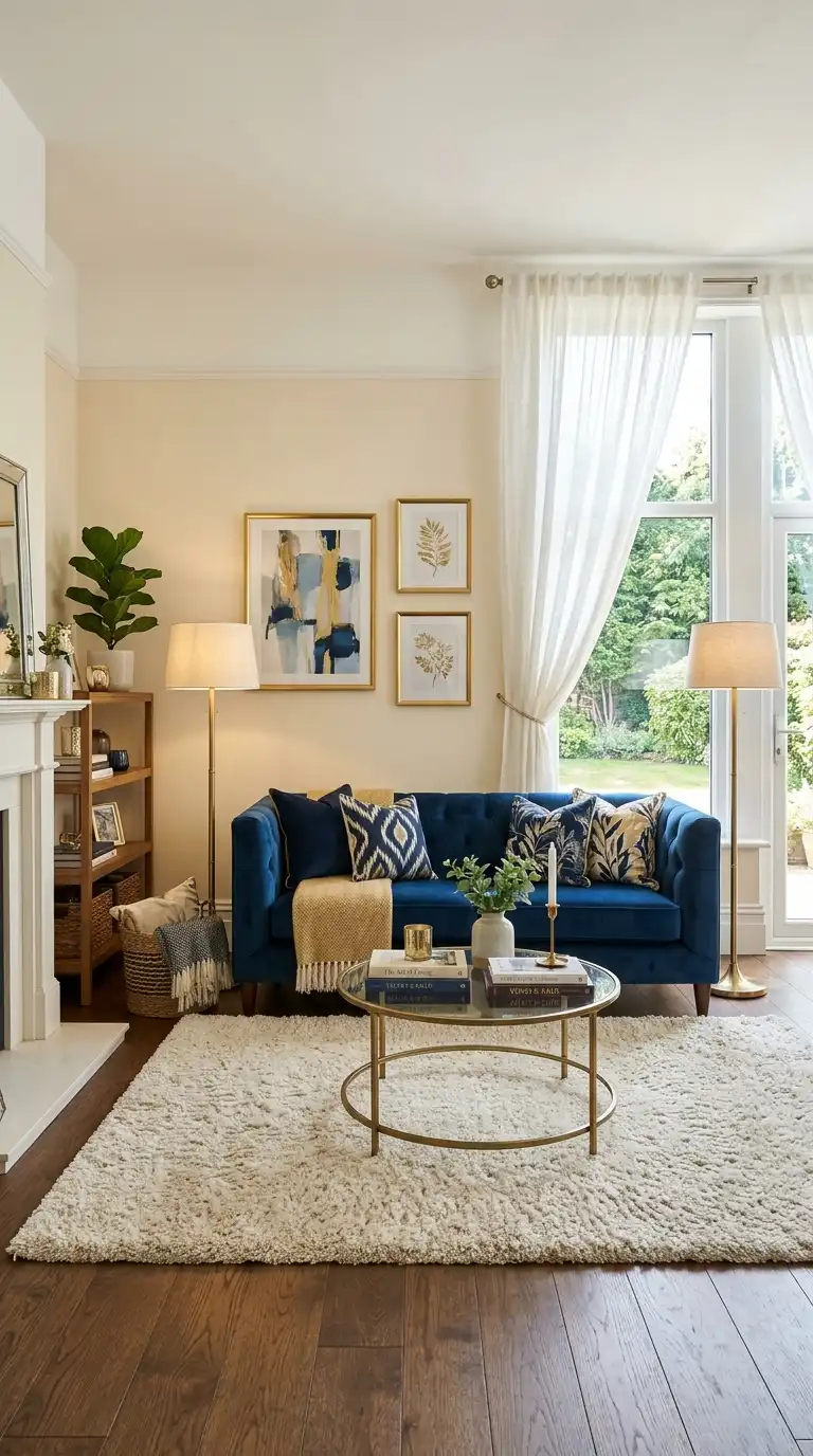 A deep blue velvet sofa serves as a stunning focal point in any living room. The plush texture and rich hue demand attention, while brass accents in coffee tables, floor lamps, and picture frames add warmth and elegance. Keep the surrounding elements neutral—cream walls, a light area rug, and sheer curtains—to let the sofa shine. Layering in brass decorative objects and gold-framed artwork enhances the luxurious feel, making this combination perfect for formal living rooms and spaces designed for entertaining.