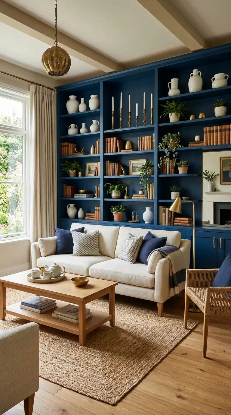 Built-in shelving painted in deep blue adds architectural interest and a rich pop of color to a living room. The deep hue creates a stunning backdrop for displaying books, ceramics, artwork, and treasured objects. Style the shelves with a mix of white ceramics, brass accents, natural wood elements, and greenery to create contrast and visual depth. A cream linen sofa opposite the built-ins provides balance, while a natural wood coffee table and jute rug add warmth and organic texture. This approach works beautifully in traditional, transitional, and eclectic interiors.