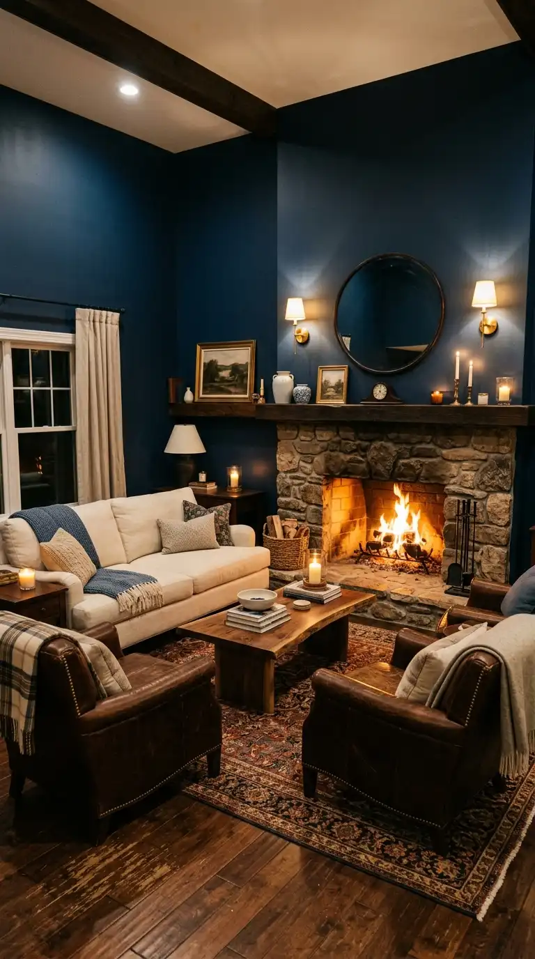 Deep blue walls create a moody, intimate atmosphere around a fireplace. The rich color enhances the warmth of the hearth, making the fireplace the heart of the room. Use warm lighting from sconces, table lamps, and candles to add softness and prevent the space from feeling too dark. Arrange comfortable seating—a cream sofa, leather armchairs—facing the fire, and add a natural wood coffee table and wool rug for texture. A crackling fire enhances the cozy, inviting ambiance, making this combination perfect for evenings spent at home.