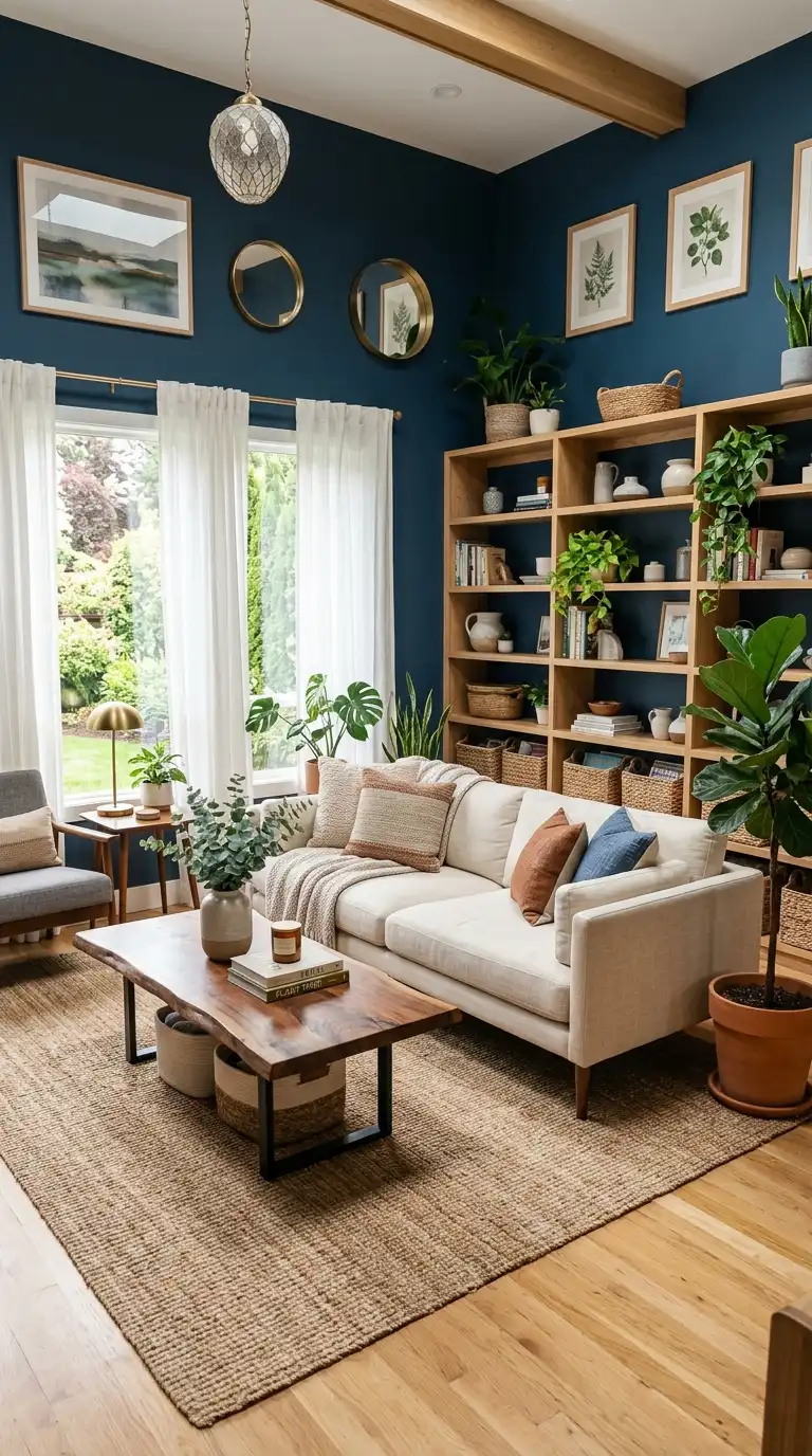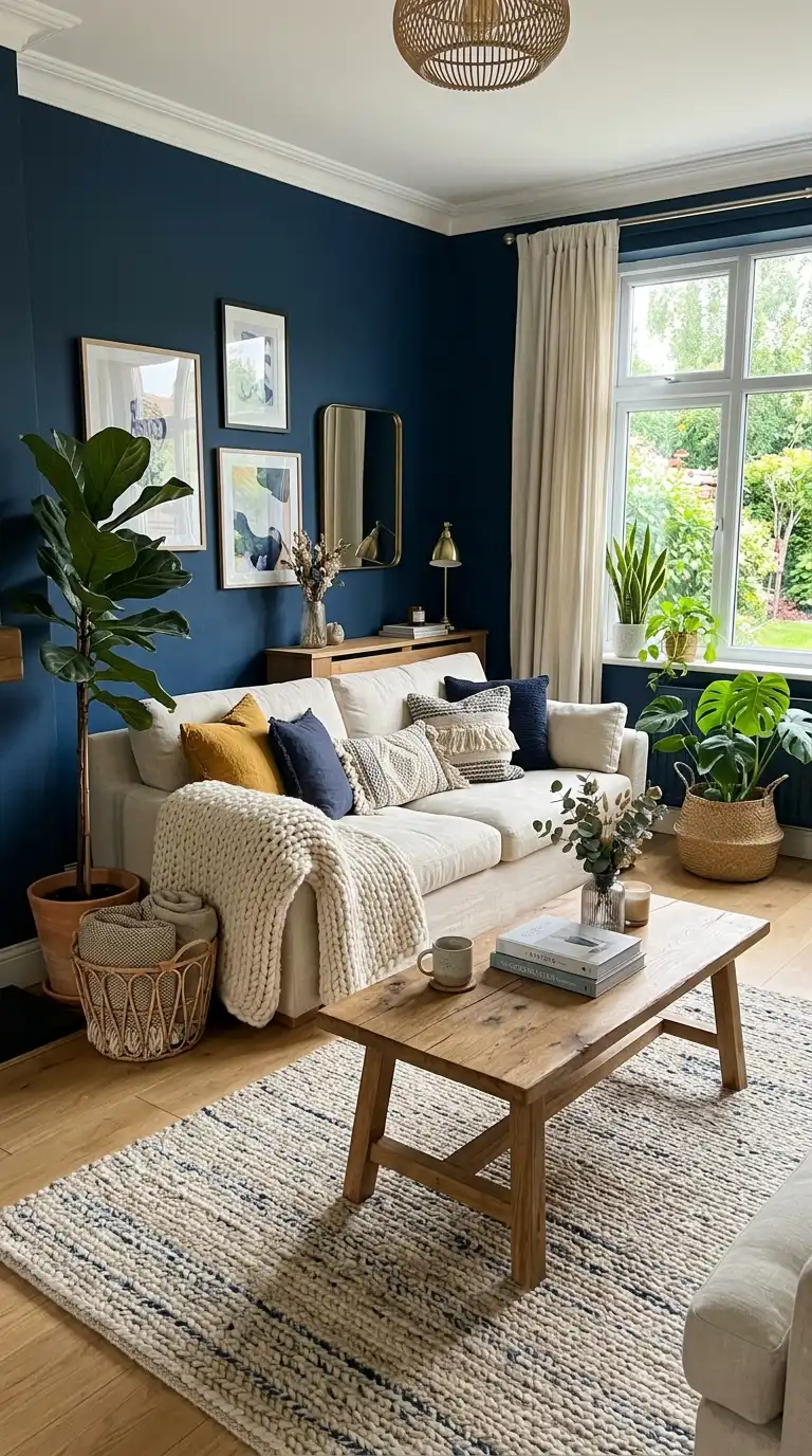 Natural wood accents add warmth and organic texture to deep blue walls, preventing the cool tones from feeling too stark. Use wood in coffee tables, shelving, flooring, or exposed ceiling beams to ground the space and add visual interest. A live-edge walnut coffee table, natural oak shelving, or reclaimed wood accents create a beautiful contrast against the deep blue. Pair with a cream or beige sofa, a jute rug, and plenty of greenery to enhance the natural, grounded feel. This combination works beautifully in Scandinavian, rustic, and contemporary interiors.