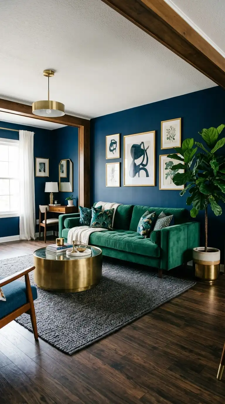 Combine deep blue with emerald green for a jewel-toned palette that feels rich, luxurious, and deeply sophisticated. The two vibrant hues work harmoniously together, creating a space that is bold yet balanced. Introduce emerald through a velvet sofa, accent chairs, throw pillows, or a patterned area rug. Brass or gold accents enhance the richness of both colors, while natural wood furniture and greenery add organic warmth. This combination is perfect for eclectic, traditional, and glam interiors where color is embraced with confidence.