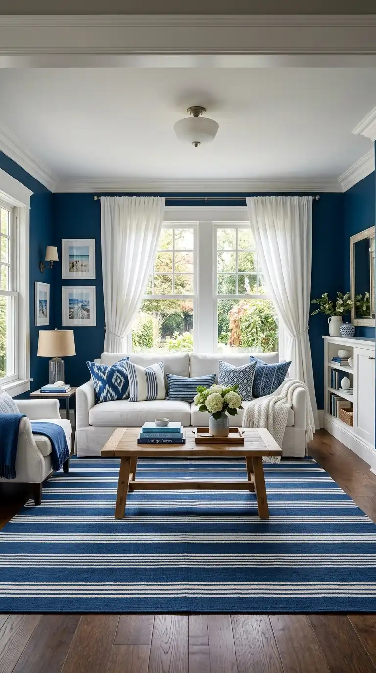 Deep blue and white is a classic combination that never goes out of style. The high contrast creates a crisp, clean look that feels both dramatic and fresh. Use deep blue on walls or furniture, and pair with crisp white trim, white sofas, and white accents. A blue and white striped rug or patterned curtains add visual interest, while natural wood accents bring warmth. This combination works beautifully in coastal, traditional, and contemporary interiors where timeless elegance is desired.