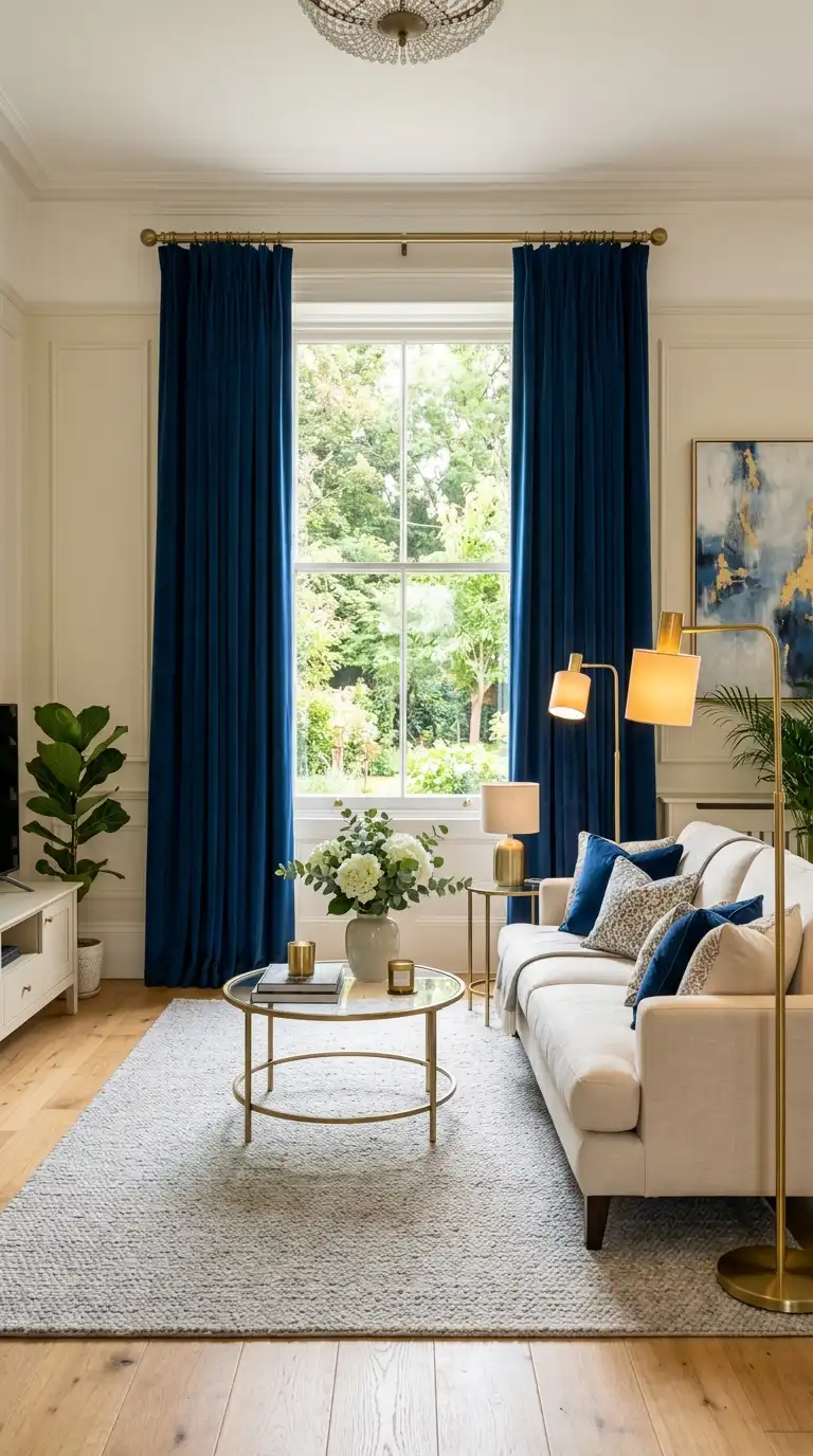 Sheer white or cream curtains provide soft contrast and allow natural light to filter through. Linen curtains in natural tones add texture while maintaining a light feel. Deep blue curtains create a seamless, monochromatic look. Patterned curtains that incorporate deep blue and complementary colors tie the palette together beautifully. - Can deep blue work in a traditional living room?