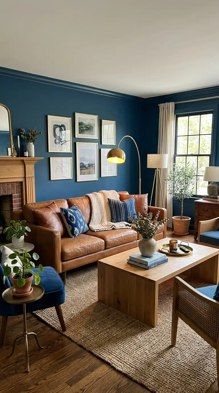 Deep blue walls paired with warm leather furniture create a rich, masculine palette that feels both sophisticated and inviting. Cognac or chestnut leather adds warmth and texture against the cool blue, while the deep walls provide a dramatic backdrop. Pair with a natural wood coffee table, a jute rug, and brass accents to complete the look. This combination works beautifully in traditional, industrial, and modern interiors where a balance of warmth and drama is desired.