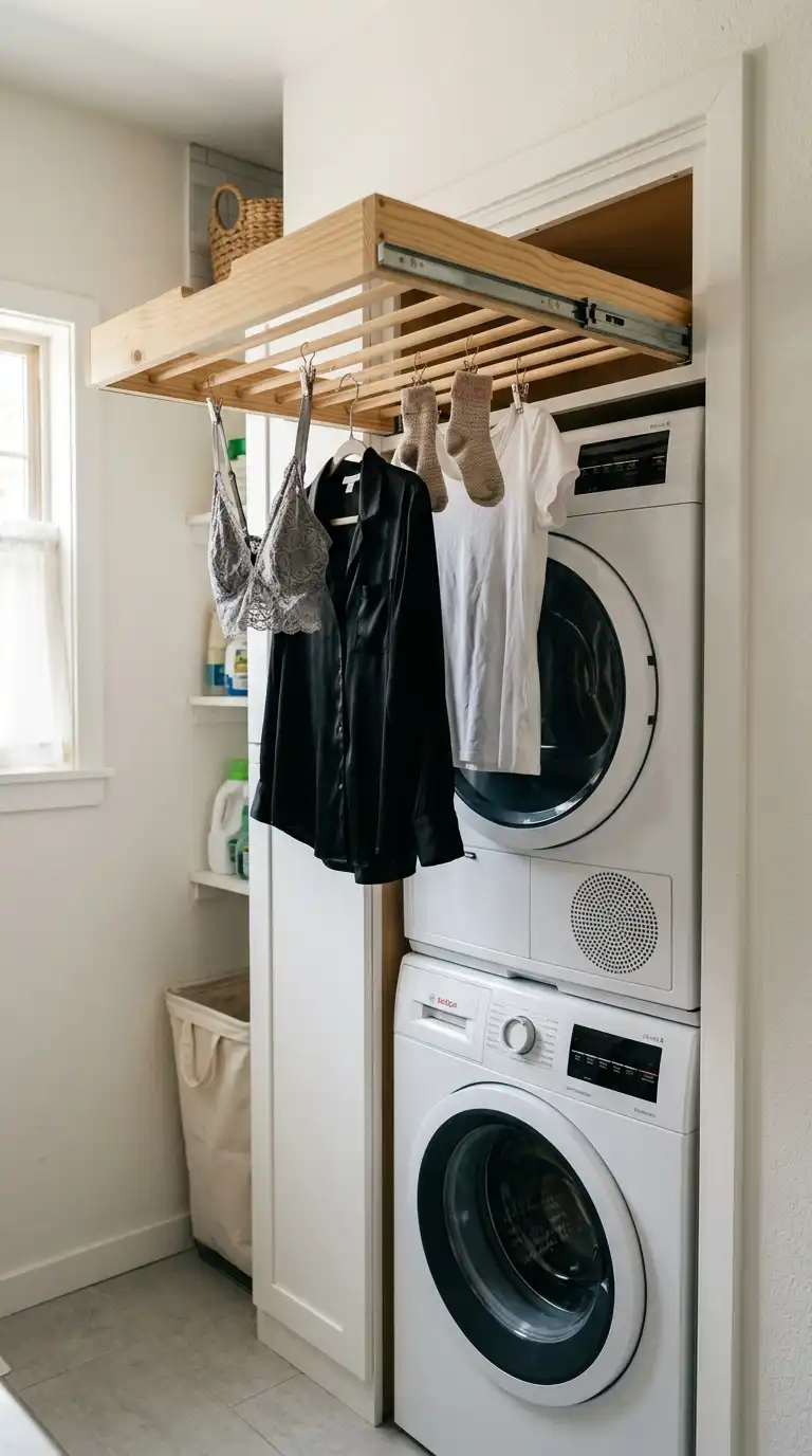 A pull-out drying rack is a space-saving solution that slides into a narrow cabinet when not in use. Install it above the washer and dryer or inside a tall, slim cabinet. When you need to air-dry delicates, pull the rack out. When you are done, slide it back and close the cabinet door. This is perfect for very small laundry rooms.
