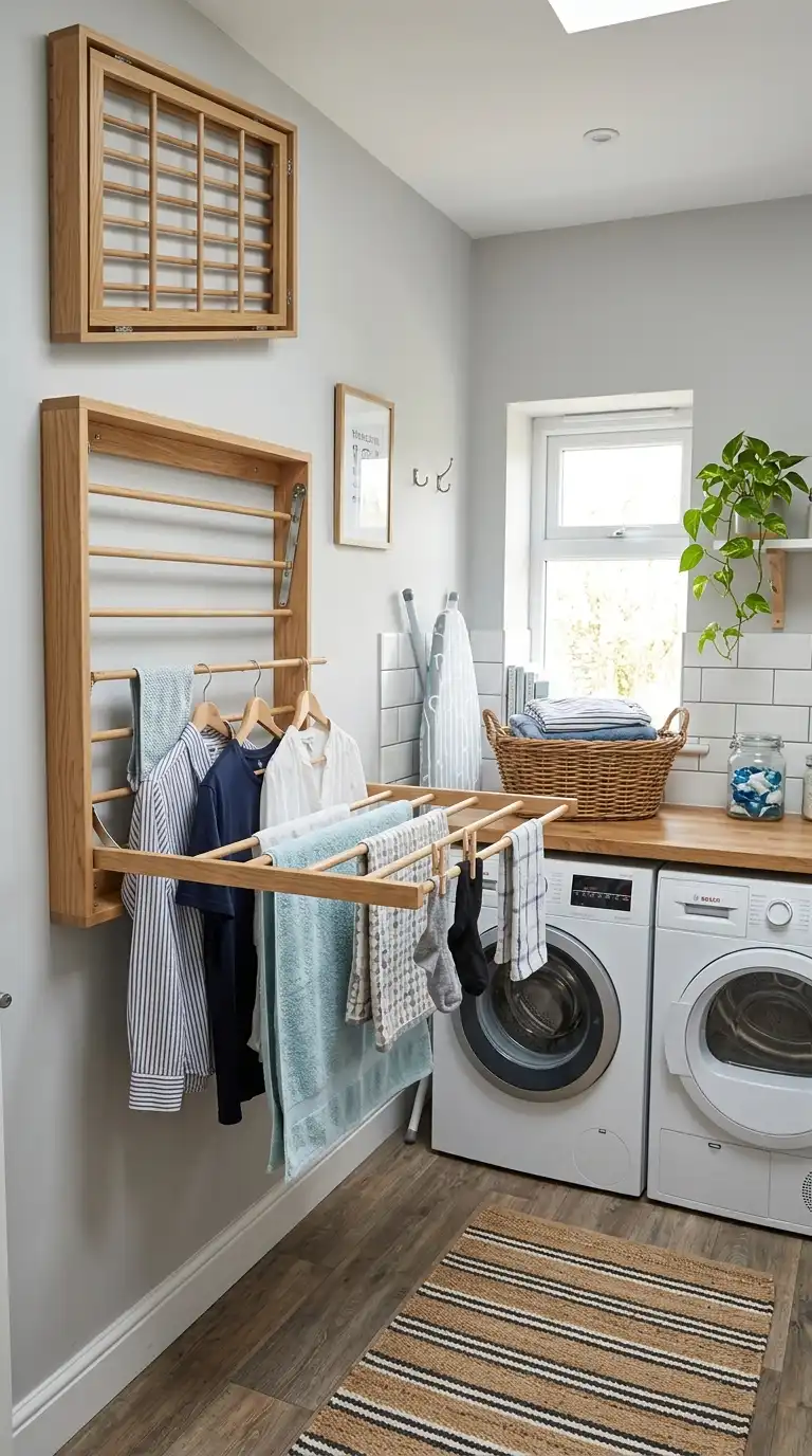A wall-mounted drying rack folds flat against the wall when not in use. When you need it, simply pull it down and extend the arms. Some models have multiple rods for hanging garments, while others have mesh shelves for laying flat. Mount it above the washer, on an empty wall, or behind a door.